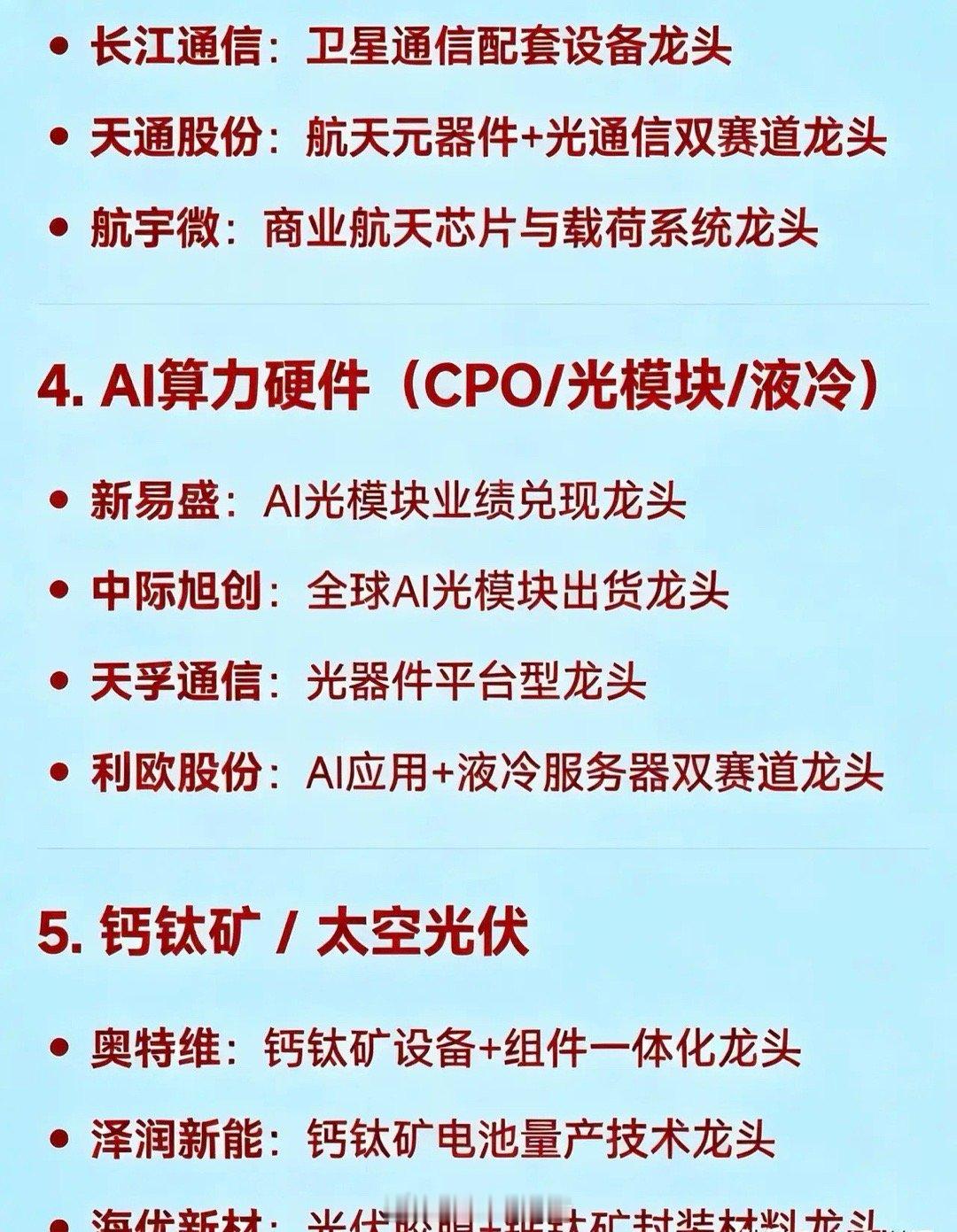 4. AI算力硬件(CPO/光模块/液冷)新易盛:AI光模块业绩持续兑现,产品迭代紧跟算力需求;中际旭创:全球AI光模块出货量龙头,深度绑定海外大厂;天孚通信:光器件平台型企业,技术覆盖多代际光模块需求;利欧股份:AI应用与液冷服务器双赛道并行,兼顾算力终端与散热解决方案。