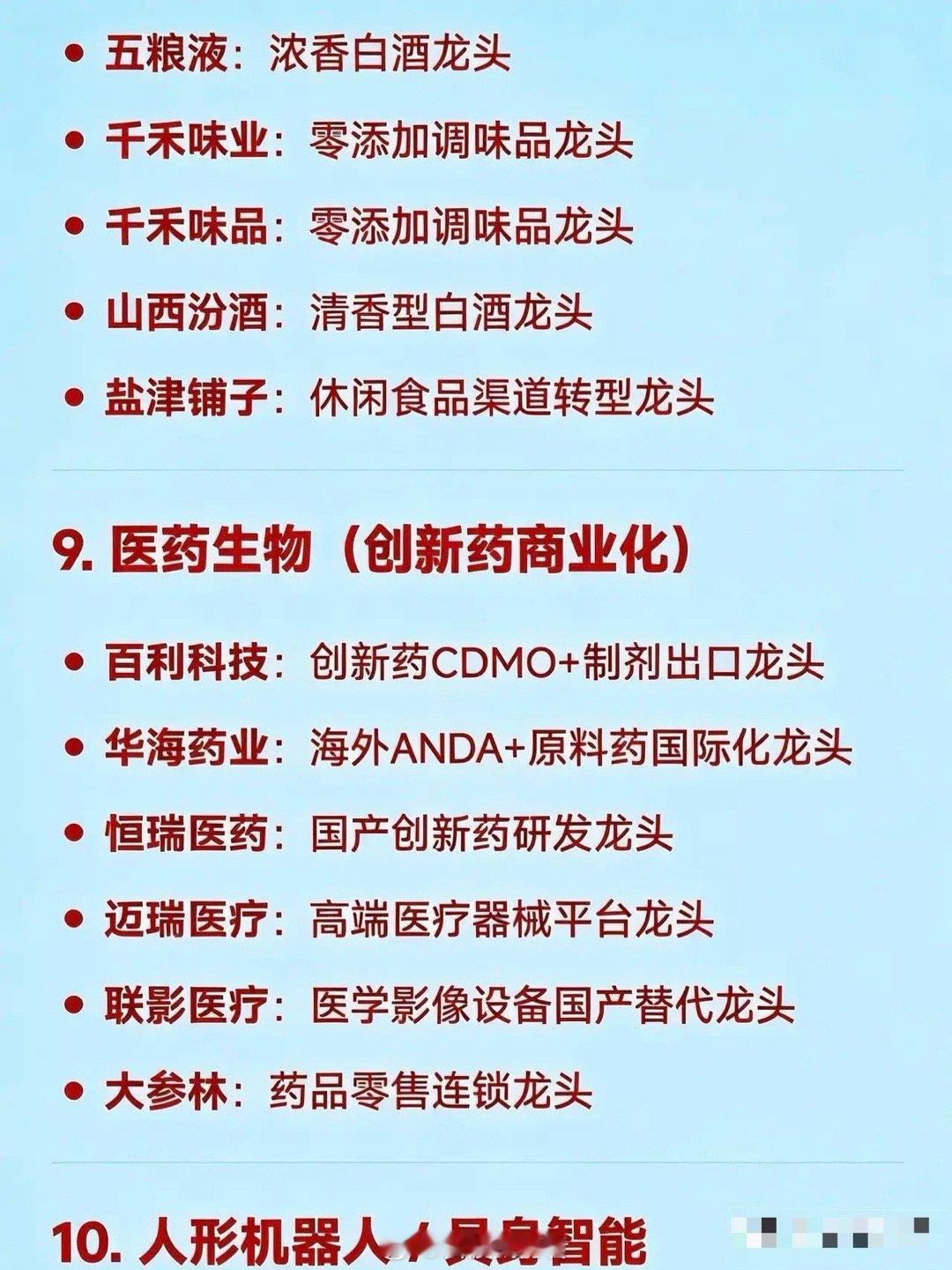 9. 医药生物(创新药商业化)百利科技:创新药CDMO与制剂出口龙头,服务全球药企,商业化能力突出;华海药业:海外ANDA与原料药国际化领先,制剂出口规模稳居前列;恒瑞医药:国产创新药研发龙头,管线丰富,多个重磅品种进入商业化阶段;迈瑞医疗:高端医疗器械平台型企业,设备覆盖多科室,进口替代加速;联影医疗:医学影像设备国产替代龙头,产品线完善,技术比肩国际一线;大参林:药品零售连锁龙头,门店网络密集,节日健康消费服务触达广。