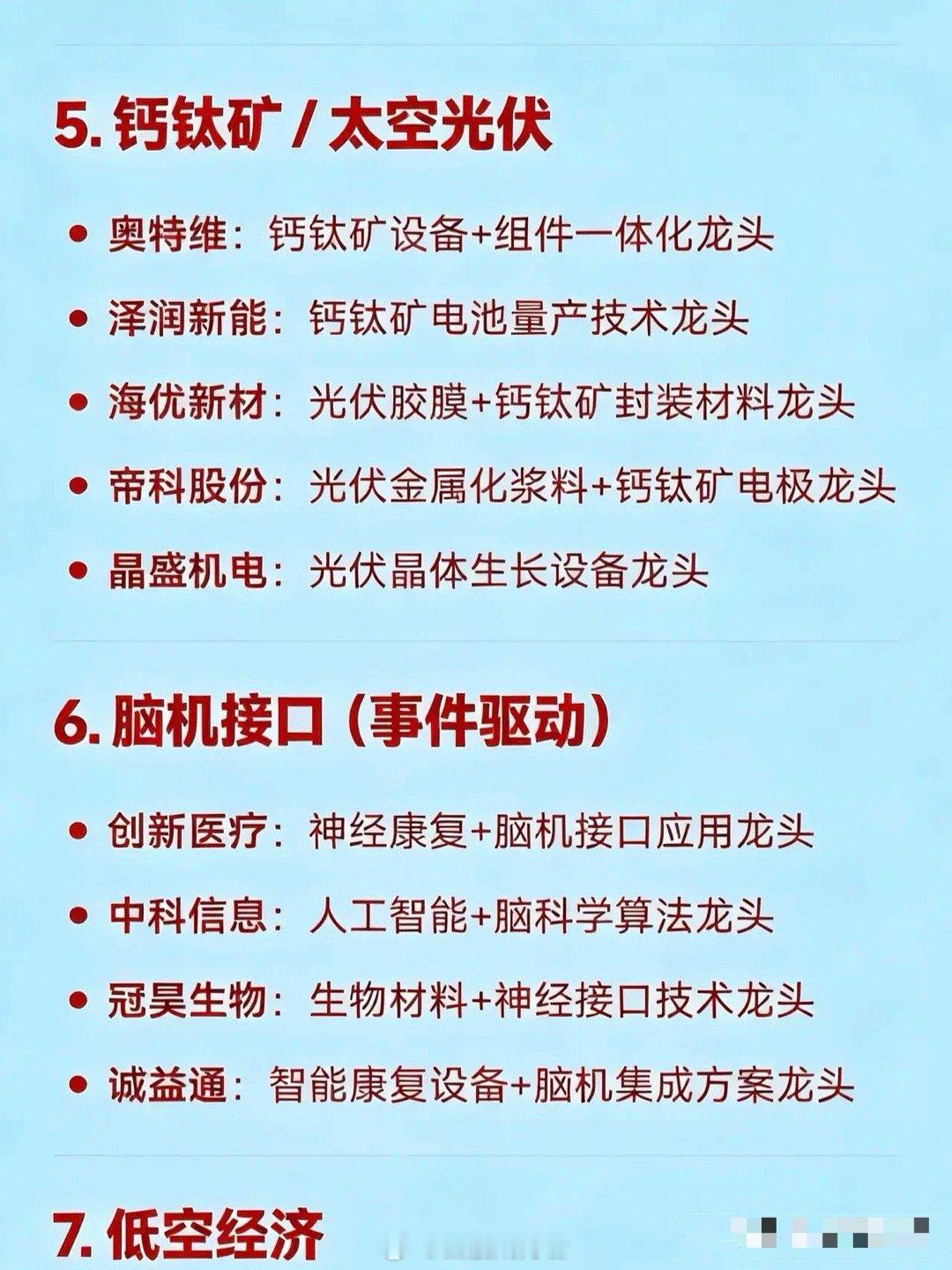 5. 钙钛矿/太空光伏奥特维:钙钛矿设备与组件一体化龙头,设备量产能力领先;泽润新能:钙钛矿电池量产技术标杆,转换效率行业领先;海优新材:光伏胶膜与钙钛矿封装材料双布局,材料性能适配新型光伏技术;帝科股份:光伏金属化浆料主力供应商,拓展钙钛矿电极材料,技术延展性强;晶盛机电:光伏晶体生长设备龙头,设备适配钙钛矿等新型光伏技术。