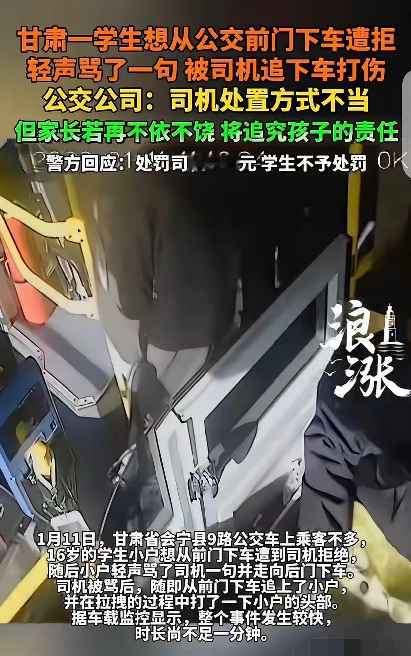 甘肃,一16岁男孩坐公交车,他想从前门下车,司机不让,男孩轻声骂了一句,被司机追下车打了一顿,男孩父亲愤怒报警,说儿子出现“急性应激反应”患上重度焦虑症,构成轻微伤,要求司机赔钱,并支付精神抚慰金。不料,公交公司回应:司机不对,但家长如果再不依不饶,将追究孩子的责任。 这个16岁男孩是甘肃会宁的在读中学生,会宁本是知名的教育大县,孩子平日埋首课业,高压的学习节奏本就容易让青春期的情绪变得敏感易碎。他并非故意挑衅公交规则,只是学生高峰时段大家常走前门下车,三次请求开门被拒后,那句轻声咒骂不过是少年人憋闷后的莽撞泄火,压根算不上蓄意侮辱。警方后续调查也明确,因男孩未成年且情节轻微,对其不予处罚,这份裁定本就兼顾了法理与情理。 男孩父亲的怒火完全能被共情,孩子被追打后确诊急性应激反应、重度焦虑,还落下轻微伤,作为家长看着孩子身心受创,第一时间报警索赔,是为人父母的本能护犊。可他只盯着司机的施暴过错,却回避了孩子先违反“前门上车、后门下车”公交准则的事实,维权的姿态里,少了对孩子行为边界的引导。 涉事司机是公交一线从业者,每天要应对客流高峰、准点考核和各类乘客纠纷,长期高压工作积攒的情绪,在被辱骂的瞬间彻底崩了堤。可职业身份本就要求从业者克制冲动,动手打人不仅违背公交行业的服务准则,更触犯了《治安管理处罚法》,警方最终对其处以800元罚款,也是对越界行为的明确惩戒。 公交公司的回应看似强硬,实则是锚定了法律与规则的边界。公司先认下司机的处置过错,还对其作出停职处理,没有袒护员工;而提出追责孩子,也并非刻意刁难,男孩在公共交通工具上辱骂他人,本就违反《治安管理处罚法》相关规定,未成年身份是从轻处理的依据,却不是免责的挡箭牌。 从民事赔偿来看,司机的施暴行为造成男孩人身损害,按《民法典》需赔偿医疗费、护理费等合理费用,精神抚慰金的主张则要结合正规诊疗记录、实际生活影响来核定,并非漫天要价都能成立。公交公司作为用人单位,还要为司机的职务行为承担连带赔偿责任,这是法律明确的权责划分。 这场冲突说到底,是规则意识缺失与情绪管控失当共同酿成的两败俱伤。少年该守公共规则,司机该守职业底线,家长维权时更该补上家庭教育的课,公交公司也该强化员工的情绪管理培训,别让小事演变成身心俱损的纠纷。 各位读者你们怎么看?欢迎在评论区讨论。