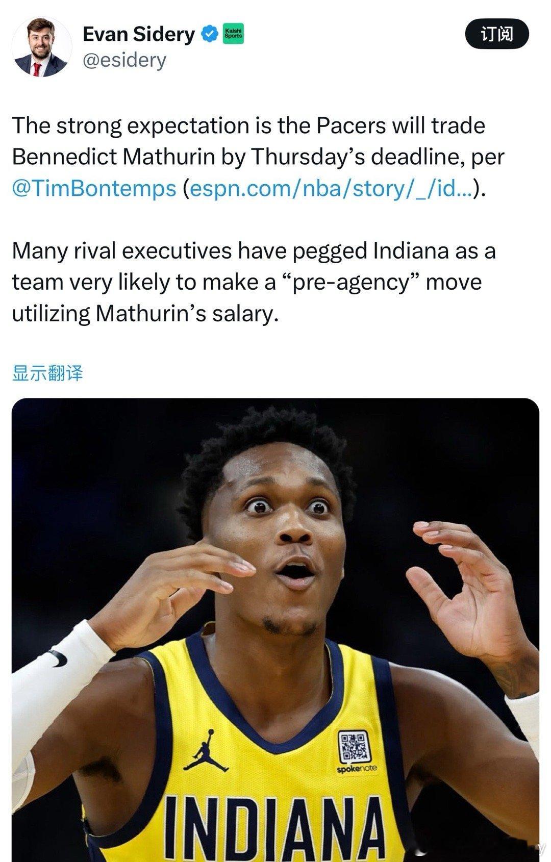Evan Sidery:步行者将在交易截止日期前送走马瑟林