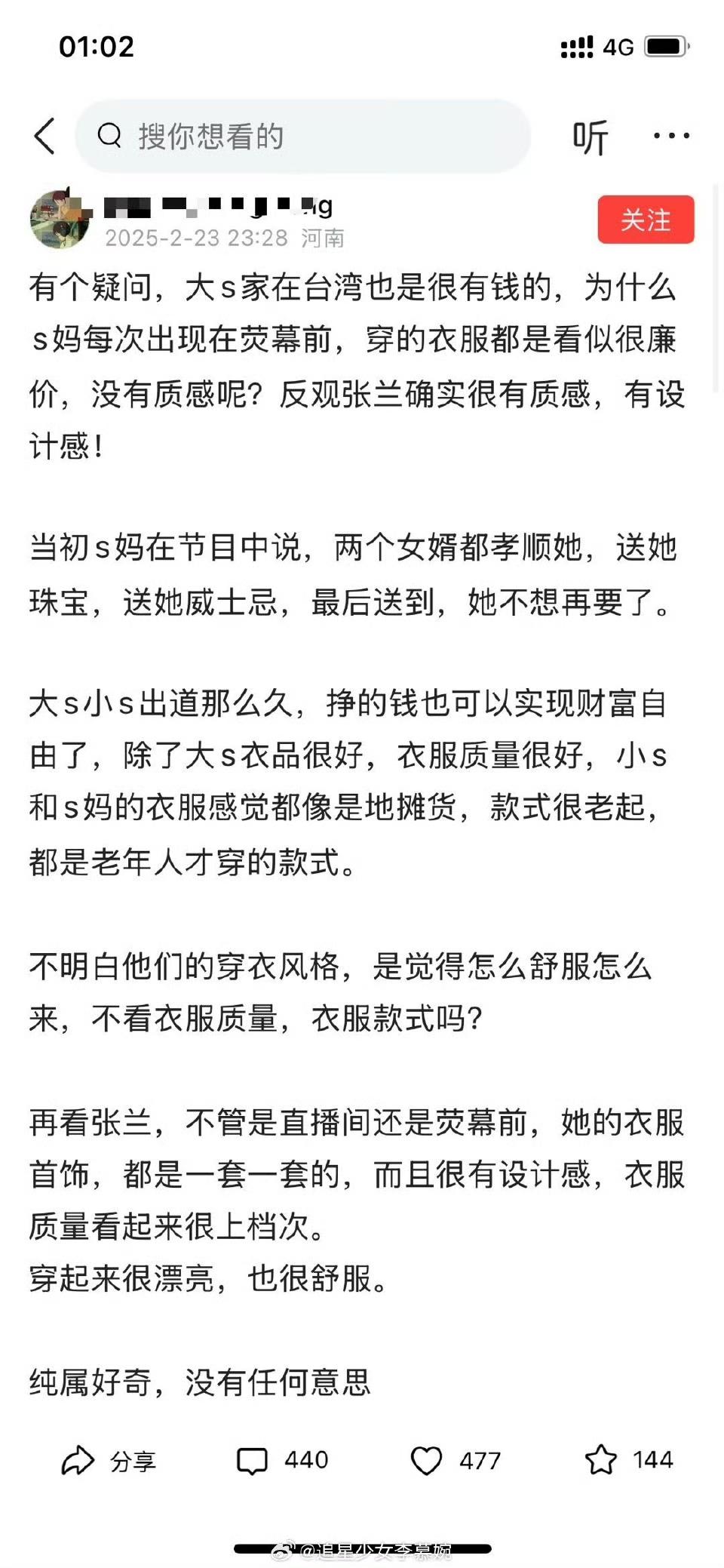 有个疑问,大s家在台湾也是很有钱的,为什么s妈每次出现在荧幕前,穿的衣服都是看似很廉价,没有质感呢?反观张兰确实很有质感,有设计感!