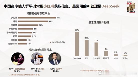 资产过亿的中国高净值人群报告:将雷军等当偶像 最爱用DeepSeek、不买车的人激增近日胡润的一份中国高净值人群的报告出炉(资产基本都过亿),其中大部分人平均年龄36岁,最常用的AI产品则是免费的DeepSeek(占调查人数的39%)。从接受调查的这些人来看,平均每年增加了2.2天的工作时长,同时减少了3天的假期休息,每天平均睡眠时间6.7小时;主要信息获取平台的前三名是小红书(68%)、抖音(48%)、视频号(32%)。外,这些人提升幸福感的最高票方式从去年的家庭活动(55%)变成了赚钱(52%),而旅游(+58%)、健康(+41%)是两大增加支出的选项。更有趣的是,调查的人当中未来两年不考虑购车的人变多(对BBA热情下降,国产新能源则偏向于华为系),对应的雇佣专职司机的人变少了,不少人开始青睐打网约车。还有两个细节,这些群体中将人生偶像首选父母,往后则是马斯克、马云、巴菲特、雷军、段永平、乔布斯,同时平均每人婚前交过5个男朋友/女朋友,财富值越高,这个数字越高。