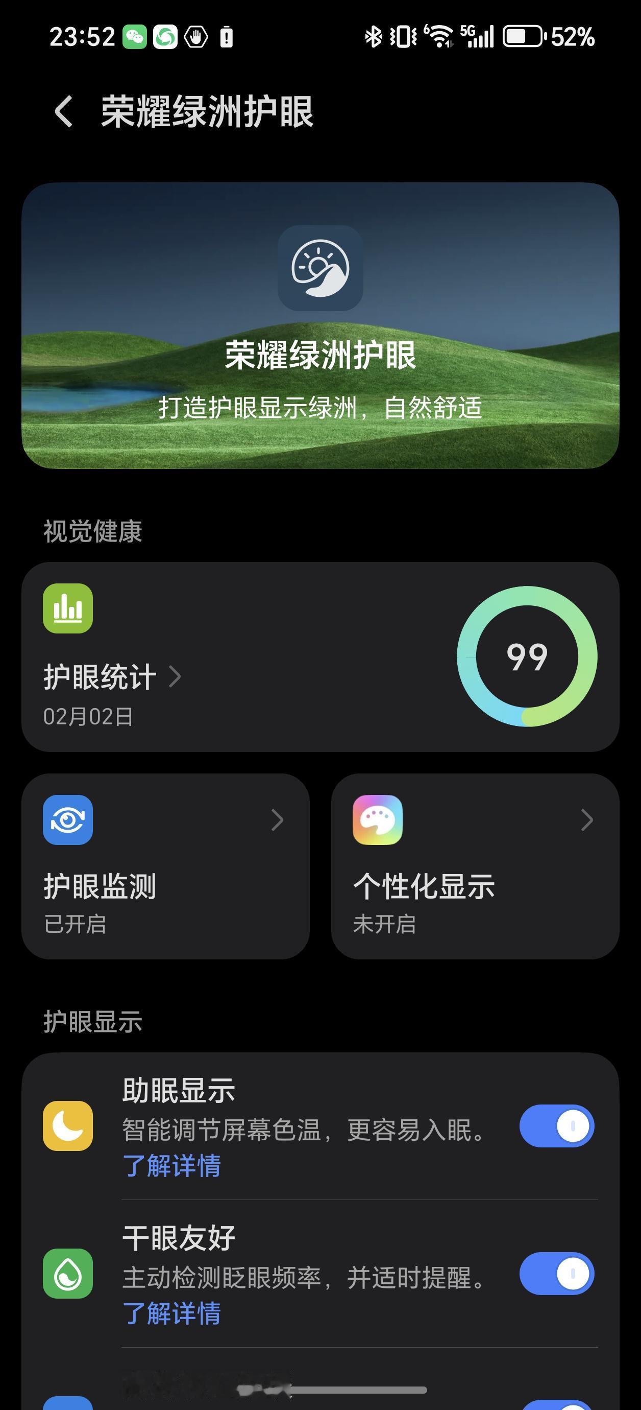 荣耀绿洲护眼确实有点东西,刷久了屏幕会弹窗提醒你眨眼。 全天候护眼监测开着,眼睛被安排得明明白白。
