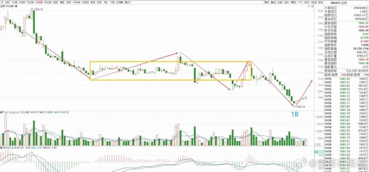 从30分钟图上看,这里继续延伸下跌中枢的离开段,不过虽然今天表现一般,但唯一的亮点是确认了背驰买点,明天就看能否继续向上,摸到中枢下沿附近,那再回调下来就有机会构建二买,从而带动短线级别完成止跌。券商行情券商