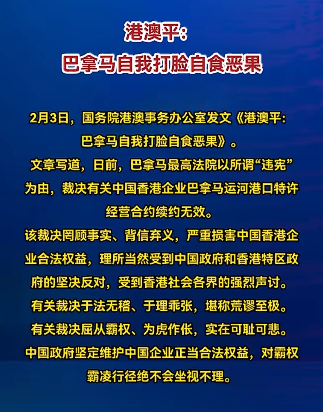 巴拿马自我打脸自食恶果 巴拿马这波操作真是“迷之自信”,自毁信用还甘当霸权“马前卒”!中国可不吃这套,坚定护企不含糊。法治契约精神不容践踏,霸权行径终将被唾弃,巴拿马当局再不收手,必自食恶果,且看其如何收场!