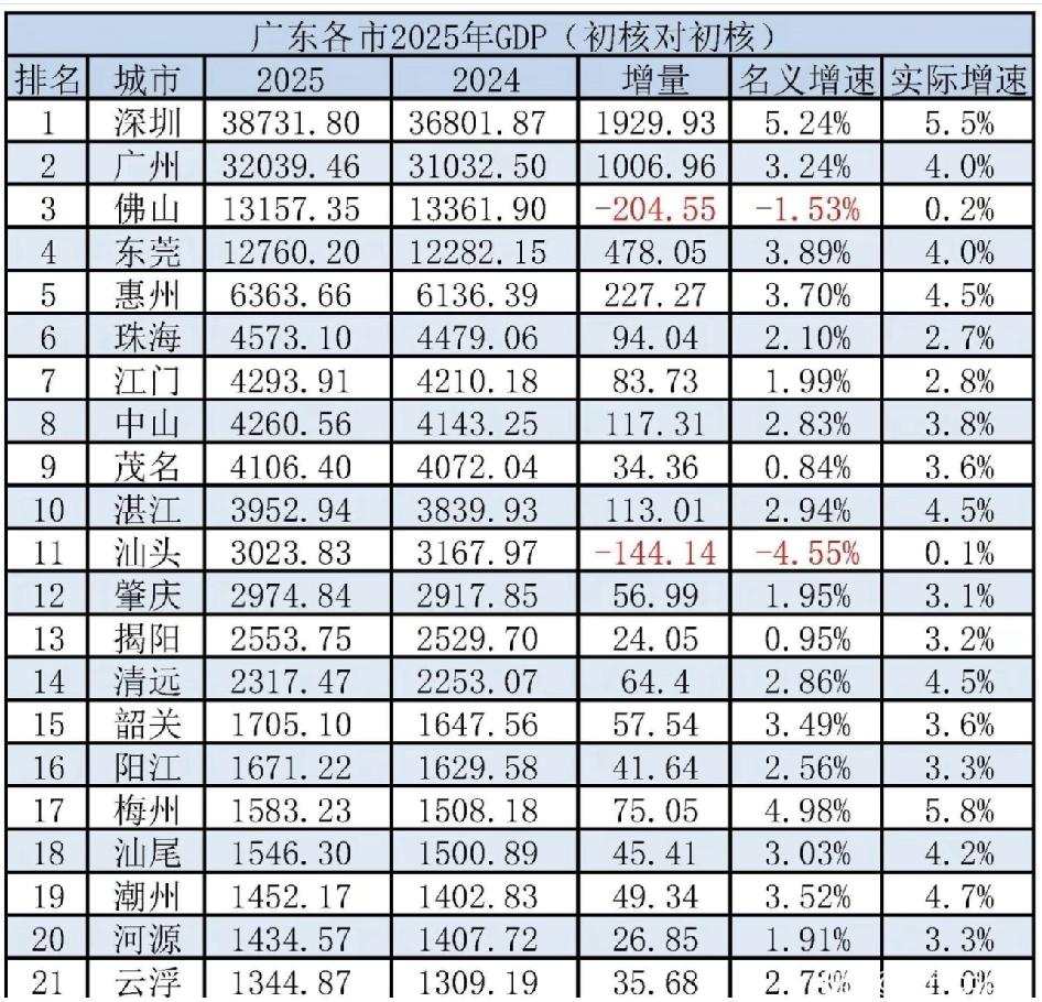 2025年广东省各市GDP数据已全部出炉啦!经济格局依旧是强者恒强,深圳、广州稳稳占据前二,佛山、东莞等也表现不俗。不过最让我意外的是揭阳,原本以为清远、韶关会更靠前,没想到揭阳凭借五金、纺织等产业的稳定发展,GDP居然高于它们,在全省排到了第13位。