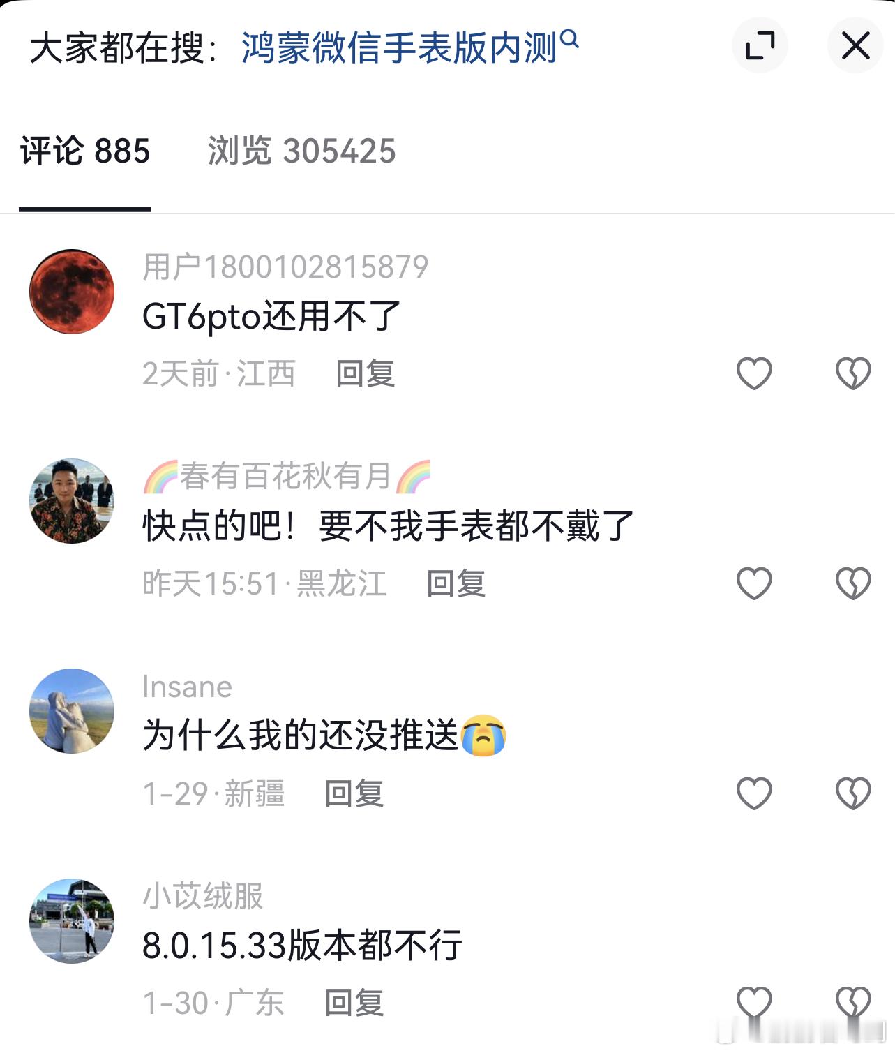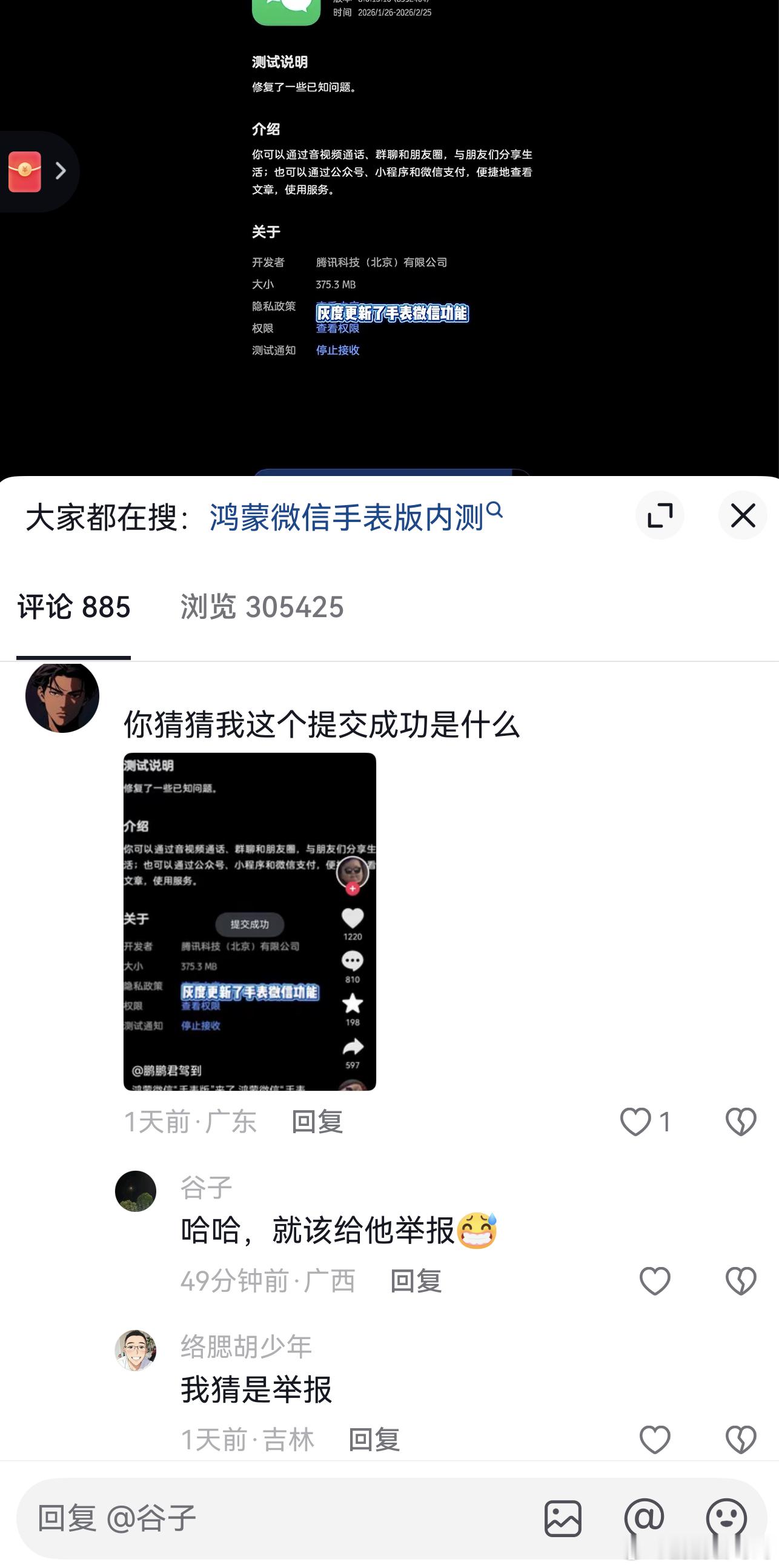 鸿蒙微信这个大晚上看的人血压飙升!前几天我发了鸿蒙微信开始内测“手表微信”的消息,然后这消息火了,结果不知道出了啥问题,微信官方应该是把这功能撤掉了,后续的更新都没有这个功能,也没人支持手表微信了。结果有网友在我的评论区举报我的视频,说我的消息是造谣,说我的内容是拼接起来的。但其实真不是造谣啊,一开始内测有少量用户是可以登陆手表微信的,他们提供的图片甚至是登陆成功的手表照片,但后面一次邀测更新,让他们本来支持的也撤掉了…只能说,这一波更新又撤回,把我害得好惨。