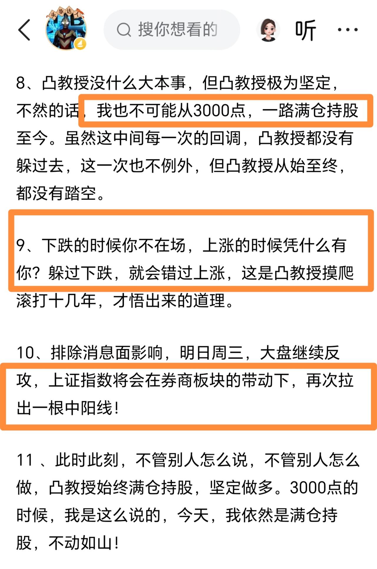 继续反弹!凸教授深夜发文,坚定看好股市超跌反弹,而且大盘会在券商的带领下进行反弹。凸教授建议不要投机低买高卖,因为躲得过大跌,也会完美错过大涨。凸教授表示他还是满仓待涨,等待一根中阳线,然后开启新一轮反弹!