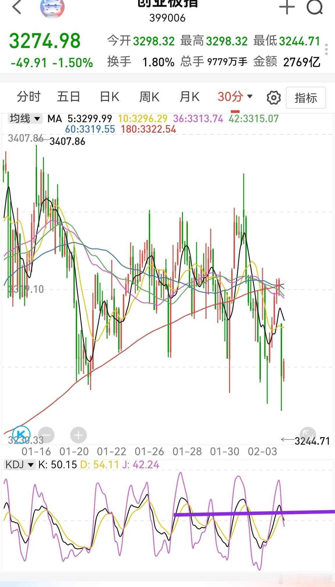 创业板一把砸到3238附近,目前半小时kdj处于中位死叉。