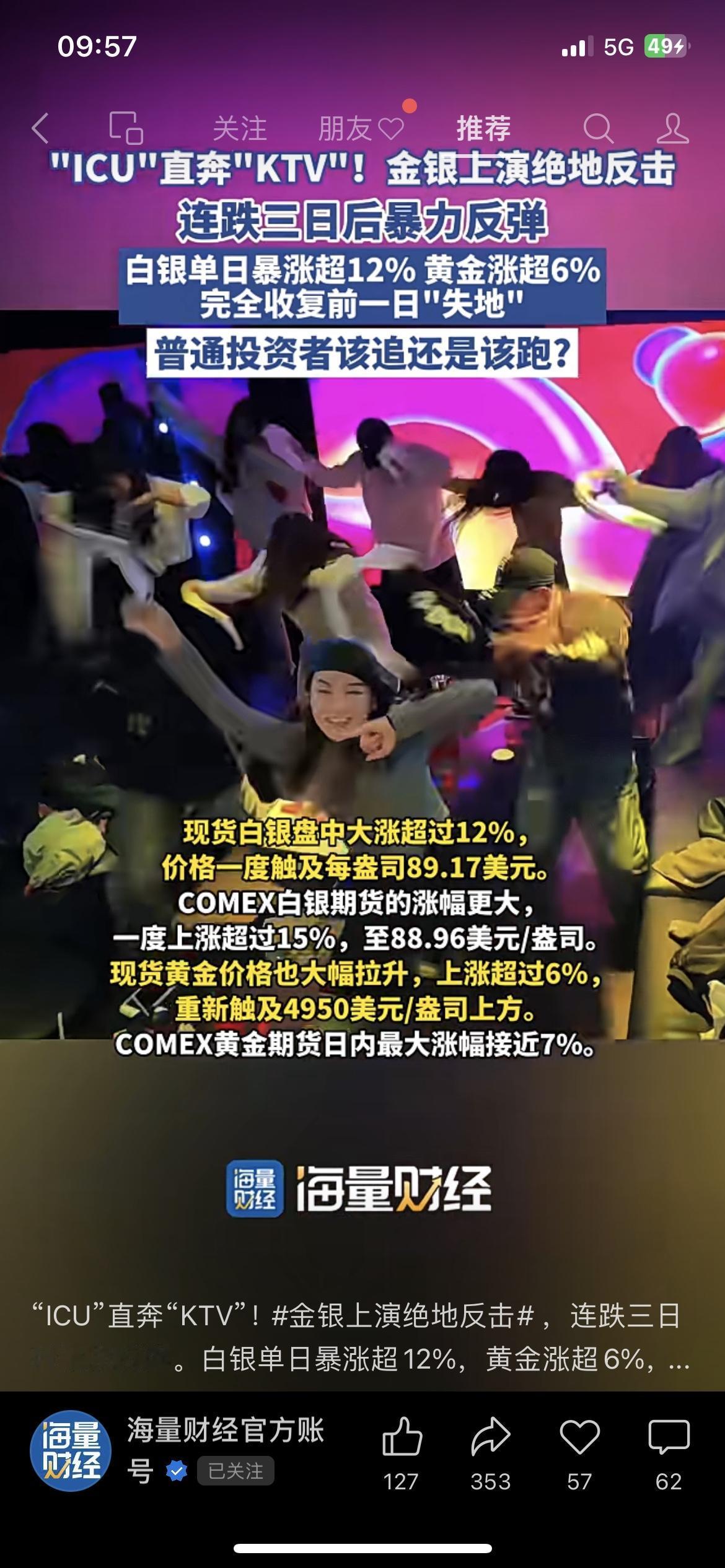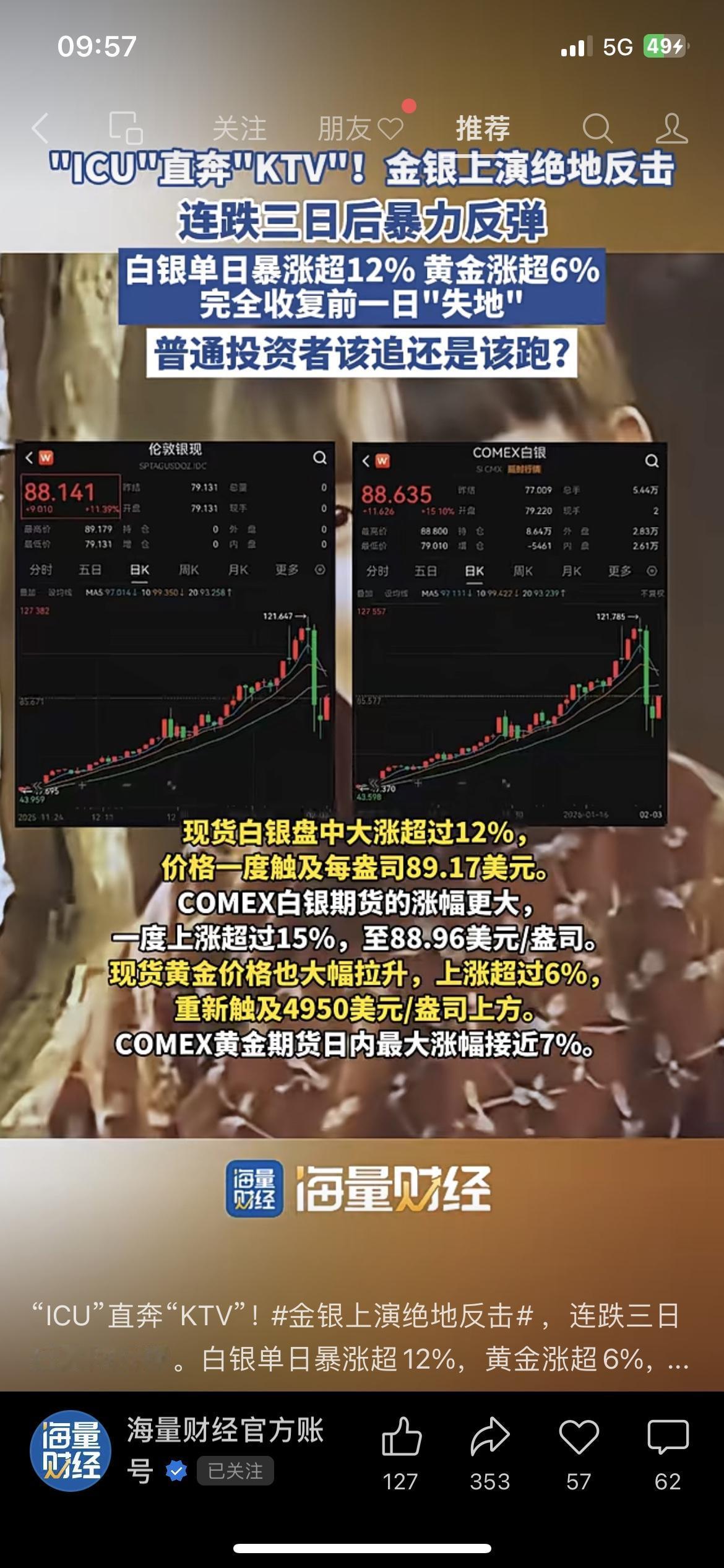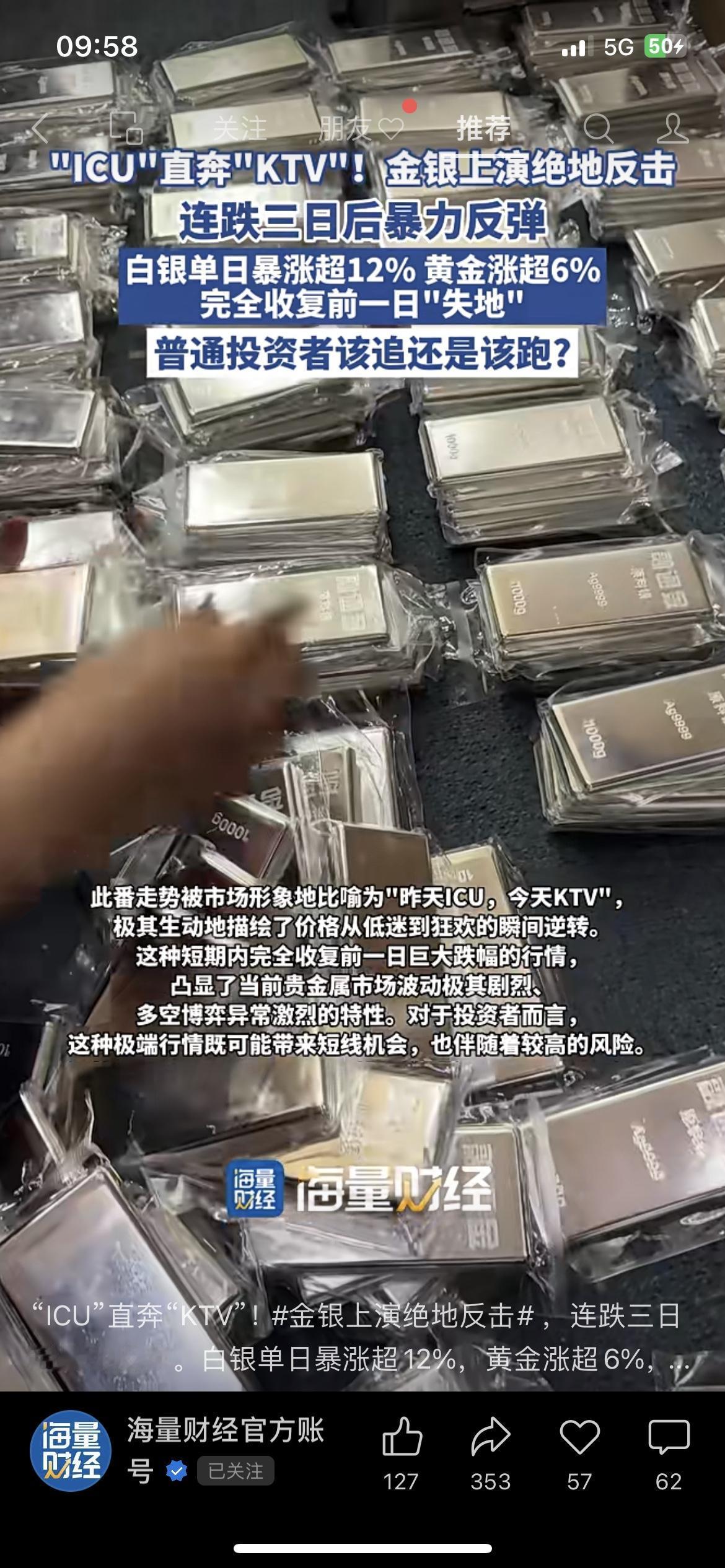 白银暴涨12%!北京大哥囤金抄底赚麻了! 刚连跌3天的金银直接“ICU转KTV”,白银单日涨超12%,黄金收复4950美元!前两天北京、上海的金店挤满大爷大妈囤金,还有北京大哥砸几十万抄底实物金,现在直呼“抄对了”!洪灏说白银底部在75-80美元,还能涨回前高。别盲目追!波动越大越要拿稳ETF,别碰高杠杆! 你会趁回调加仓金银ETF,还是等企稳再入手? 黄金理财 白银投资 财经热点 (注:市场有风险,投资需谨慎)