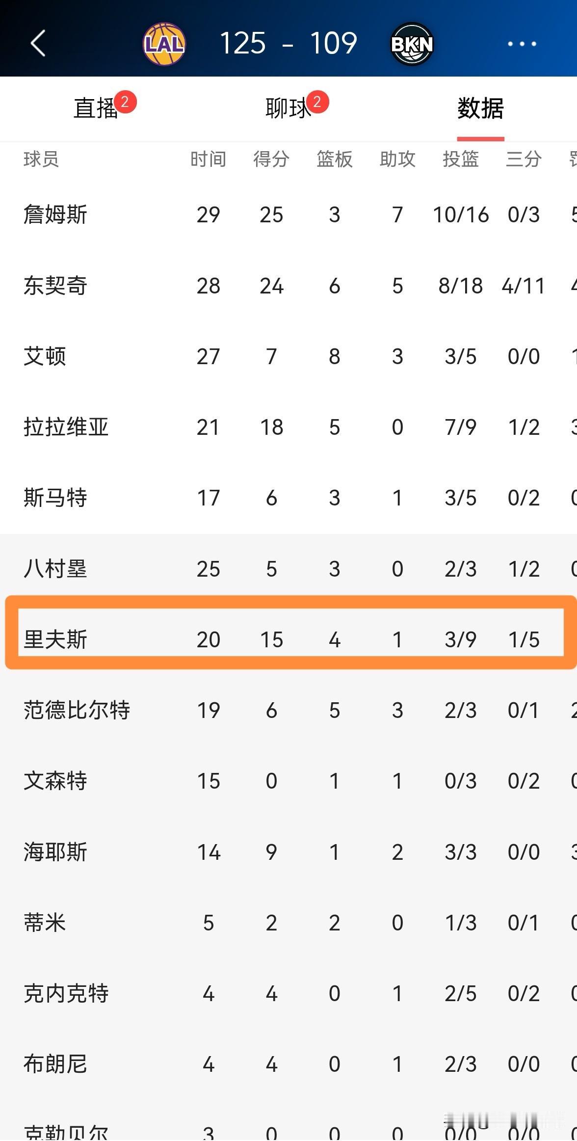 湖人超级球星里弗斯的状态真是令人惊喜!在今天湖人客场以125:109轻取篮网的比赛中,伤愈复出的里弗斯展现出了令人惊喜的竞技状态。 全场比赛下来,里弗斯替补出战20分钟,投篮9中3,其中三分球5中1、罚球10中8得到15分,还有4篮板1助攻2抢断,他的场上正负值为+10。 坦白说,由于里弗斯刚刚伤愈复出,因此他的投篮手感比较冰凉是可以理解的,里弗斯最让人感到惊喜的地方在于,他对于篮筐的冲击力依然非常强,整场比赛下来里弗斯的罚球数高居全队第一。