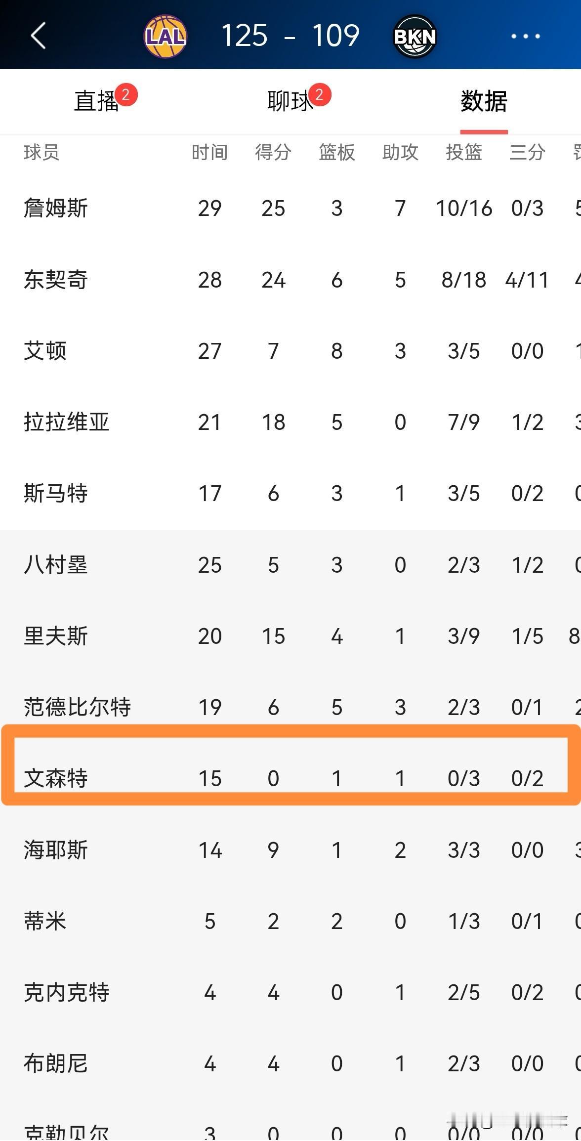 湖人大将文森特真是出工不出力!在今天湖人客场以125:109击败篮网的比赛中,文森特在攻防两端都显得斗志不足,给人一种出工不出力的感觉。 整场比赛下来,文森特替补出战15分钟,投篮3中0怒砍0分,他的场上正负值为-9。 值得一提的是,文森特是湖人常规轮换阵容里唯一没有得分的球员,他的低迷表现完全对不起他的上场时间。