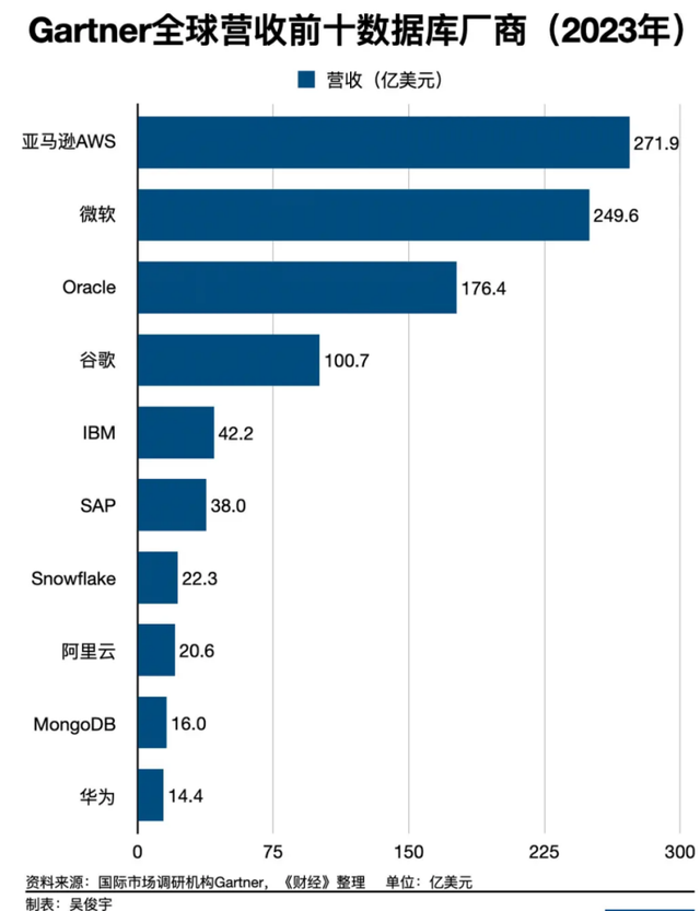 目前,全球数据库市场仍然是国际软件公司占据主导地位。前五依旧是美国厂商,亚马逊AWS、微软、Oracle、谷歌、IBM。