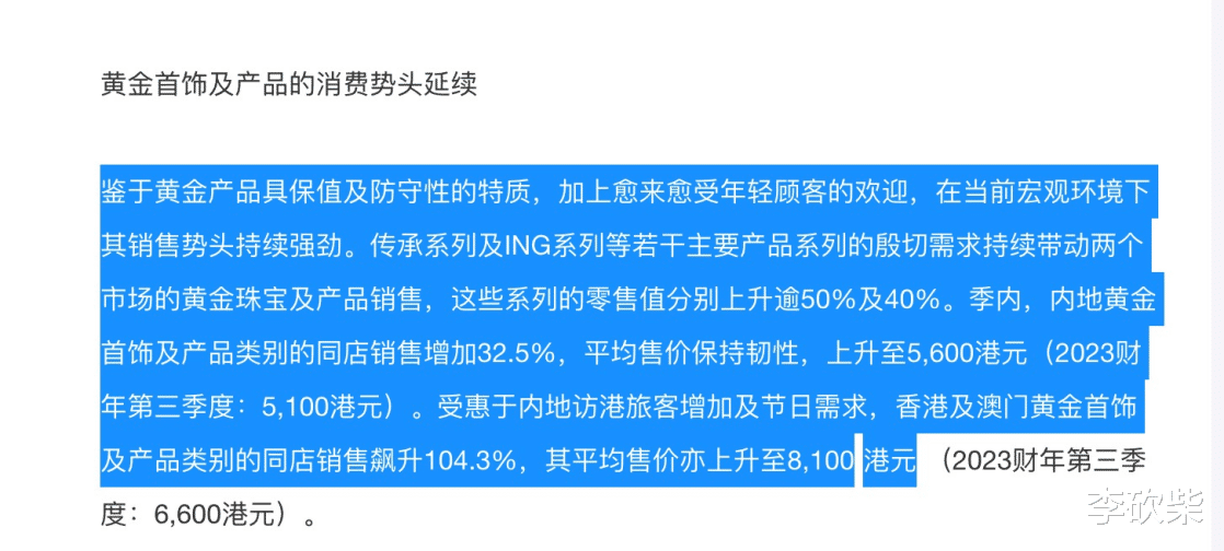 据2024年度第三季度财报(截至 2023 年 12 月 31 日止三个月)显示,周大福零售销售额增长超46%。