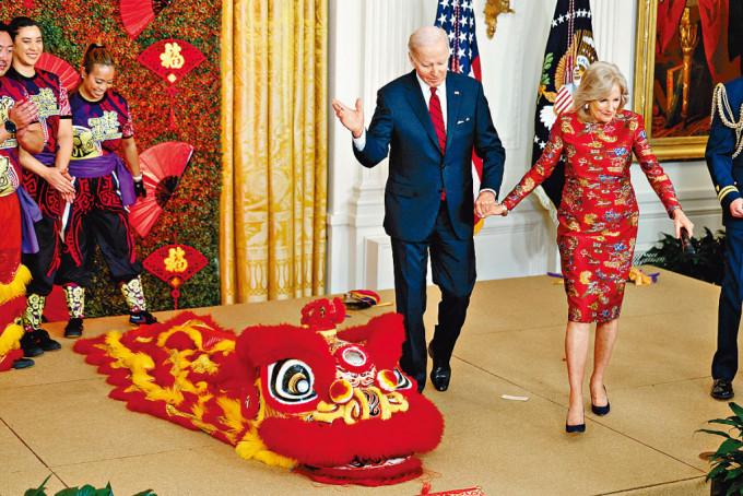 白宫舞狮庆新春,第一夫人大红裙亮相。 美国总统拜登周四晚在白宫欢庆农历春节,第一夫人吉尔一身大红绣花裙亮相,现场还有舞狮助兴,热闹非常。 这是白宫首度举行农历春节庆祝活动。吉尔当天穿着大红绣花洋装裙,搭配系红领带的拜登,年味十足。拜登谈及农历新年,原来做了点小功课。他说,对多数人来说,今年是兔年,但对越南社区群众,今年则是猫年。兔子代表认真、执着、勇于面对巨大挑战。猫则是雄伟、亲爱与保护者。 白宫也首度请来舞狮现场表演,精彩的演出让拜登与现场观众欢呼连连。
