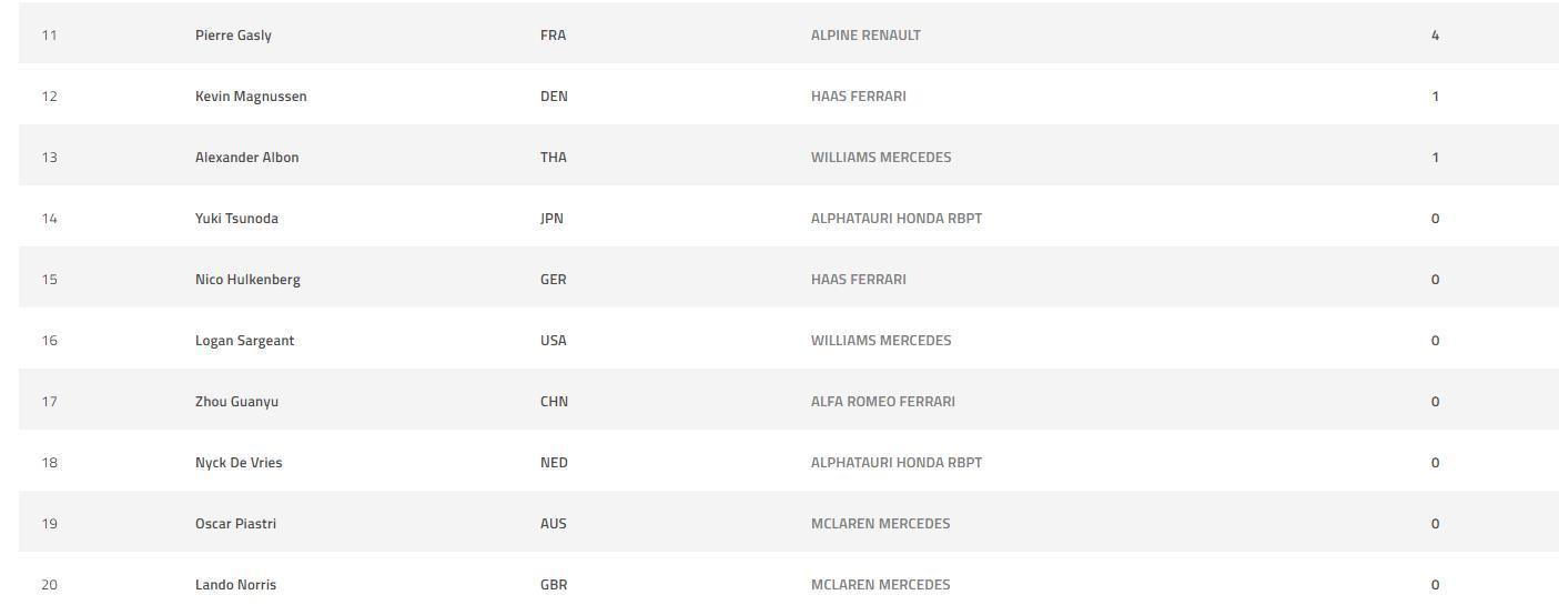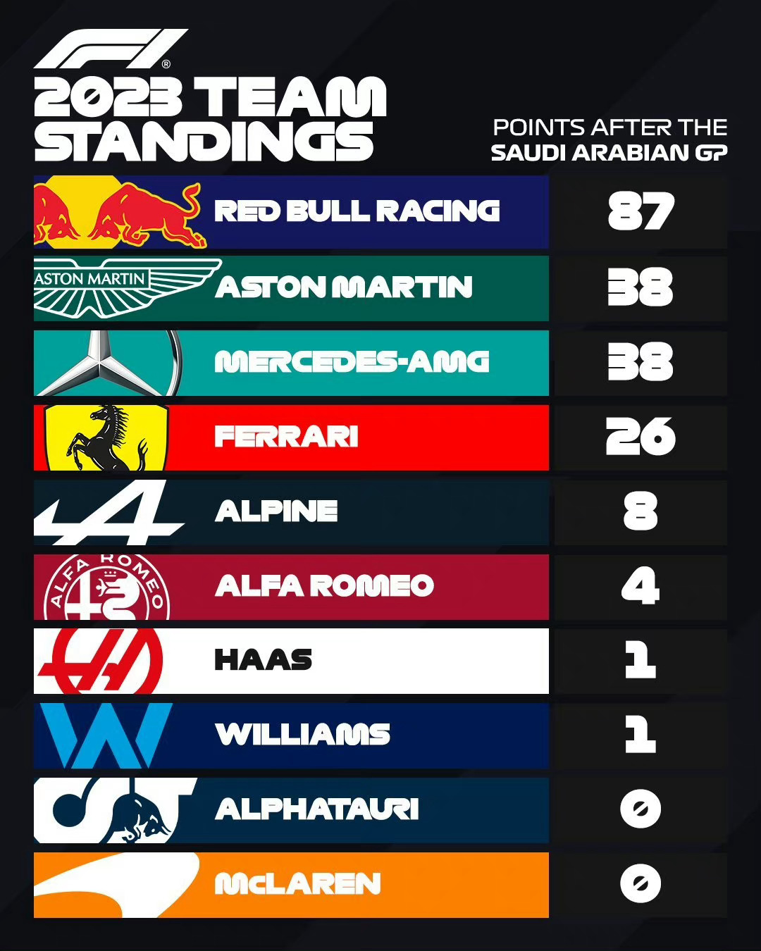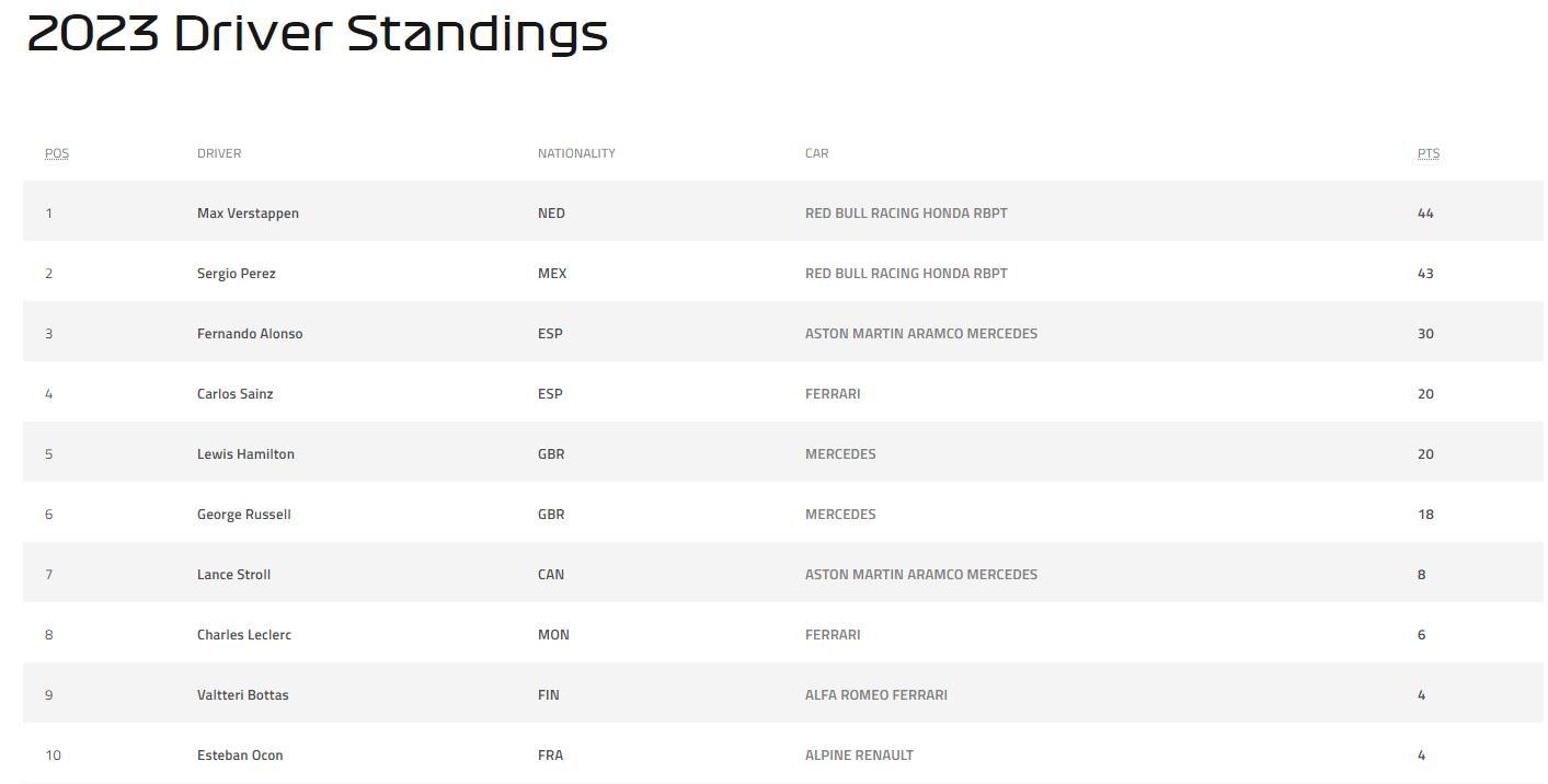 2023F1第二站沙特大奖赛赛后车手和车队积分榜
