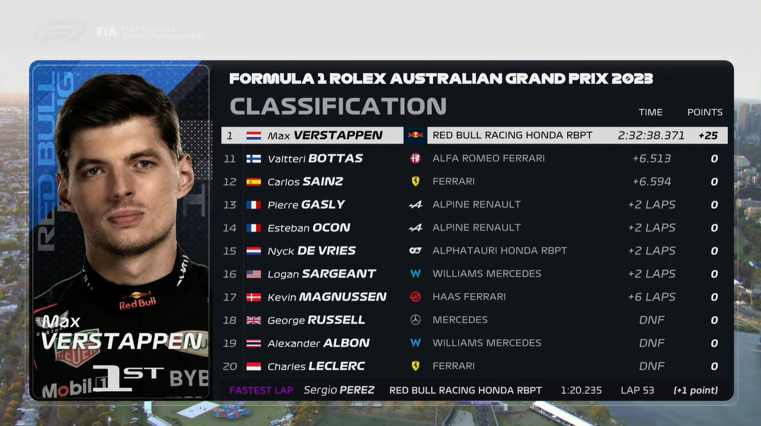 2023澳大利亚大奖赛正赛最终成绩表👇