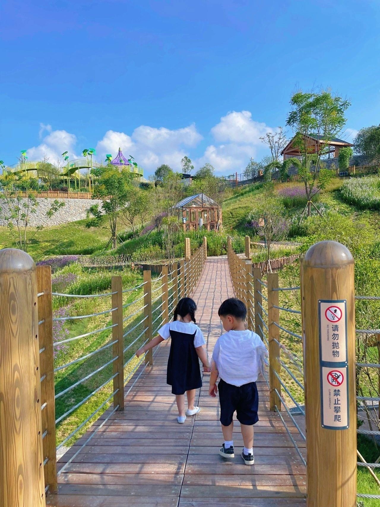 除了这些可爱的小动物们 还有各种室外马卡龙色游玩设施 玻璃栈道 花海 阳光花房 热气球等 很适合拍照