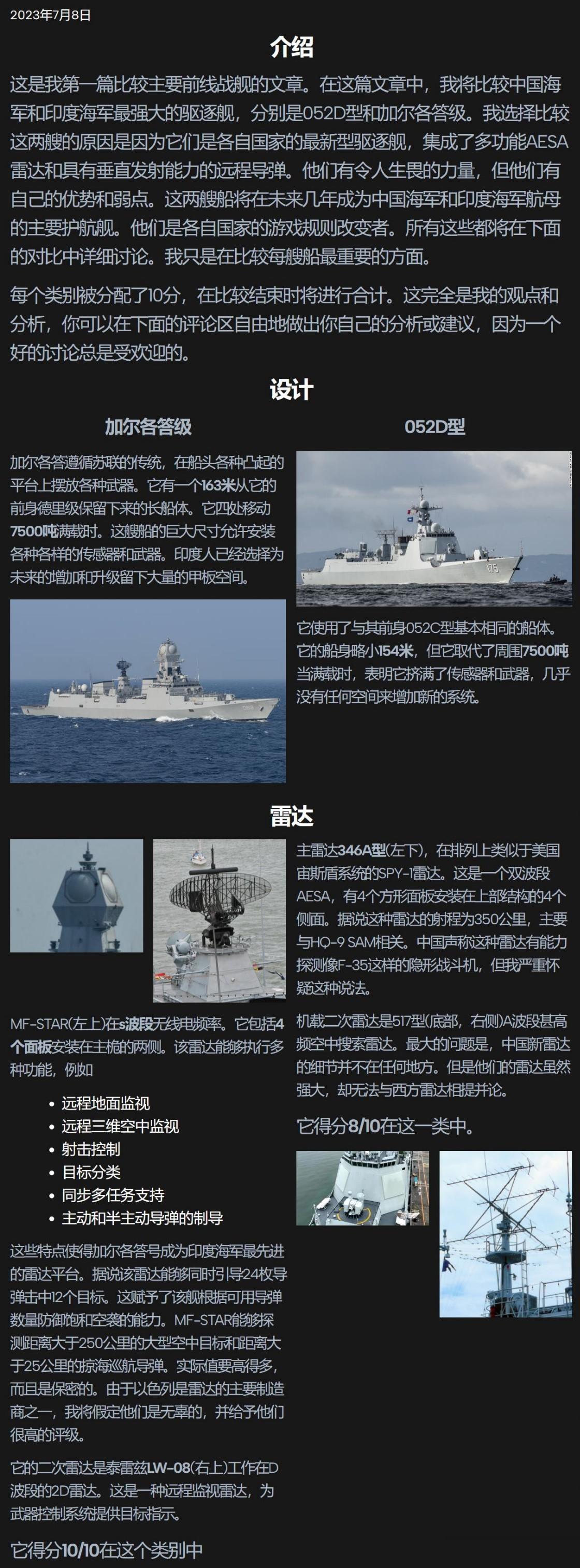 秀啊,不愧是亚洲最强的印度海军,印度媒体在全面(设计、雷达、武器、防空、反潜)对比“加尔各答”级驱逐舰和052D驱逐舰之后,得出了“加尔各答”级在雷达方面胜过052D、综合性能仅略逊于052D的结论。