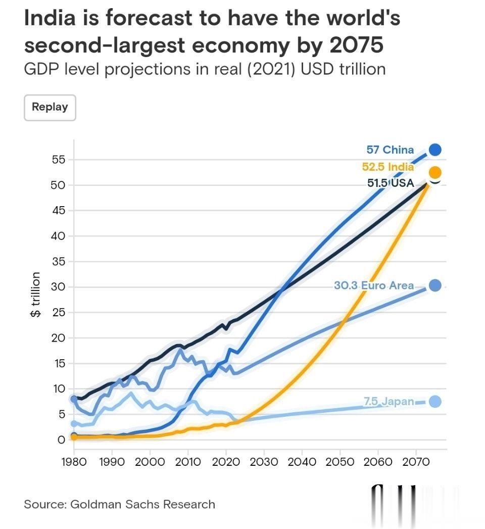 我比高盛准,印度人口今年超过中国,GDP 2050.55年超过米国,2060.75年超过中国,准确率120%。赌输了,我给你1000块。