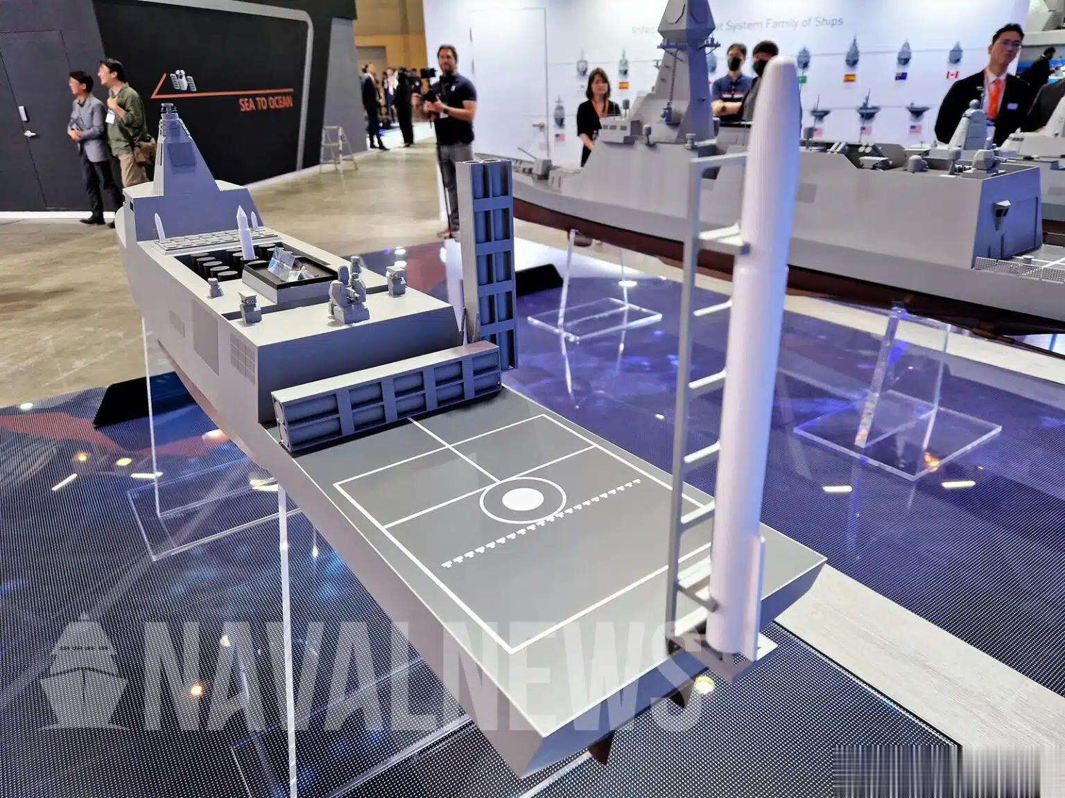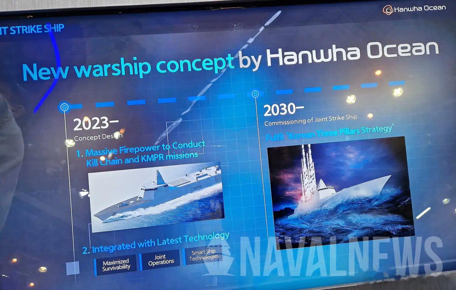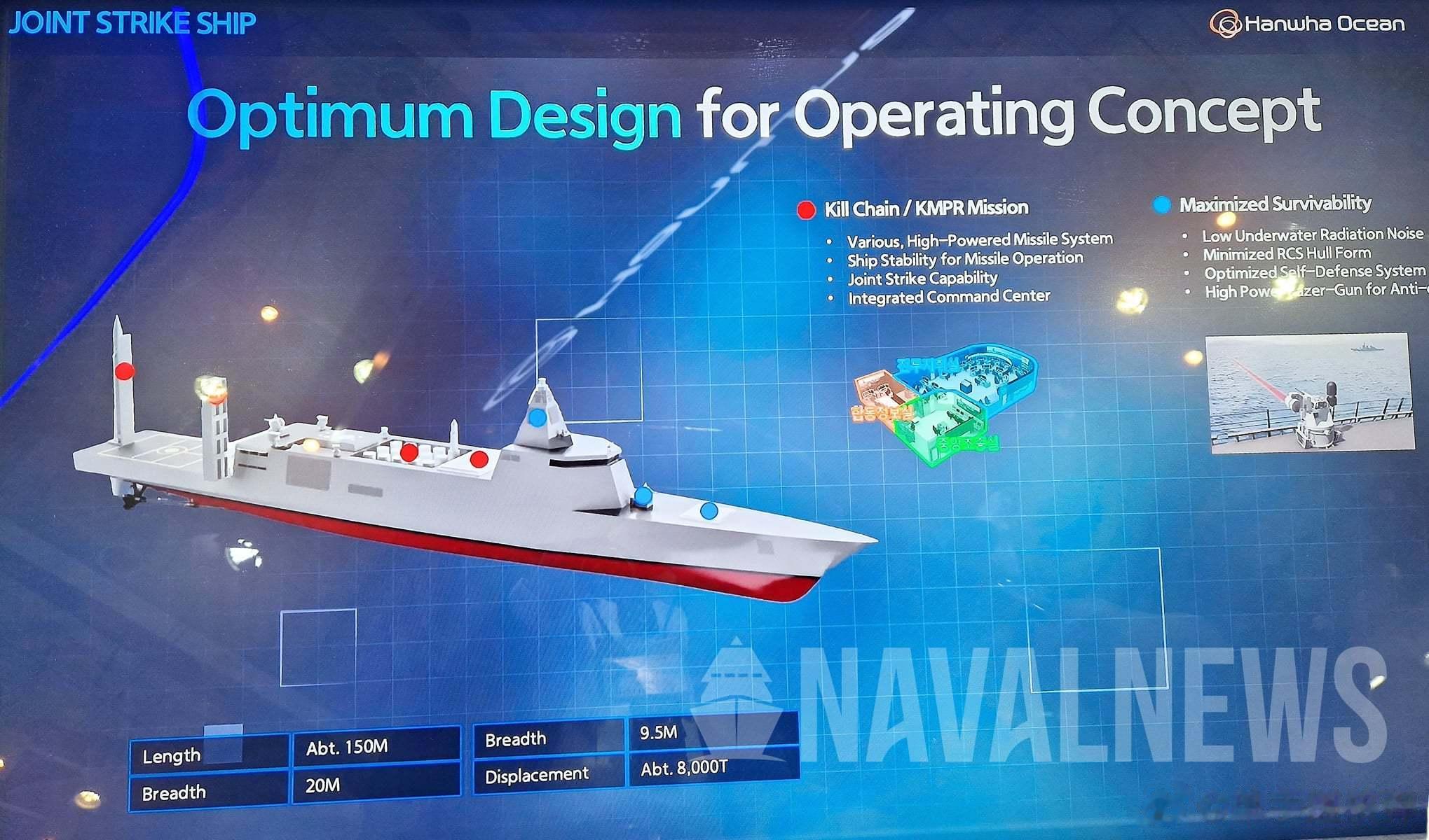 在MADEX 2023期间,韩国的韩华海洋推出了自家的“联合攻击舰”模型以及设计方案,该舰排水量约8000吨,可以配备100枚各型导弹,除常规垂发外,该舰中部还配备了尺寸较大的15个弹道导弹垂发,舰尾起飞甲板配备至少4枚可竖起的射程3000公里的弹道导弹,妥妥的是一款“武库舰”,真不愧是宇宙第一大国…… [doge]#武器装备#
