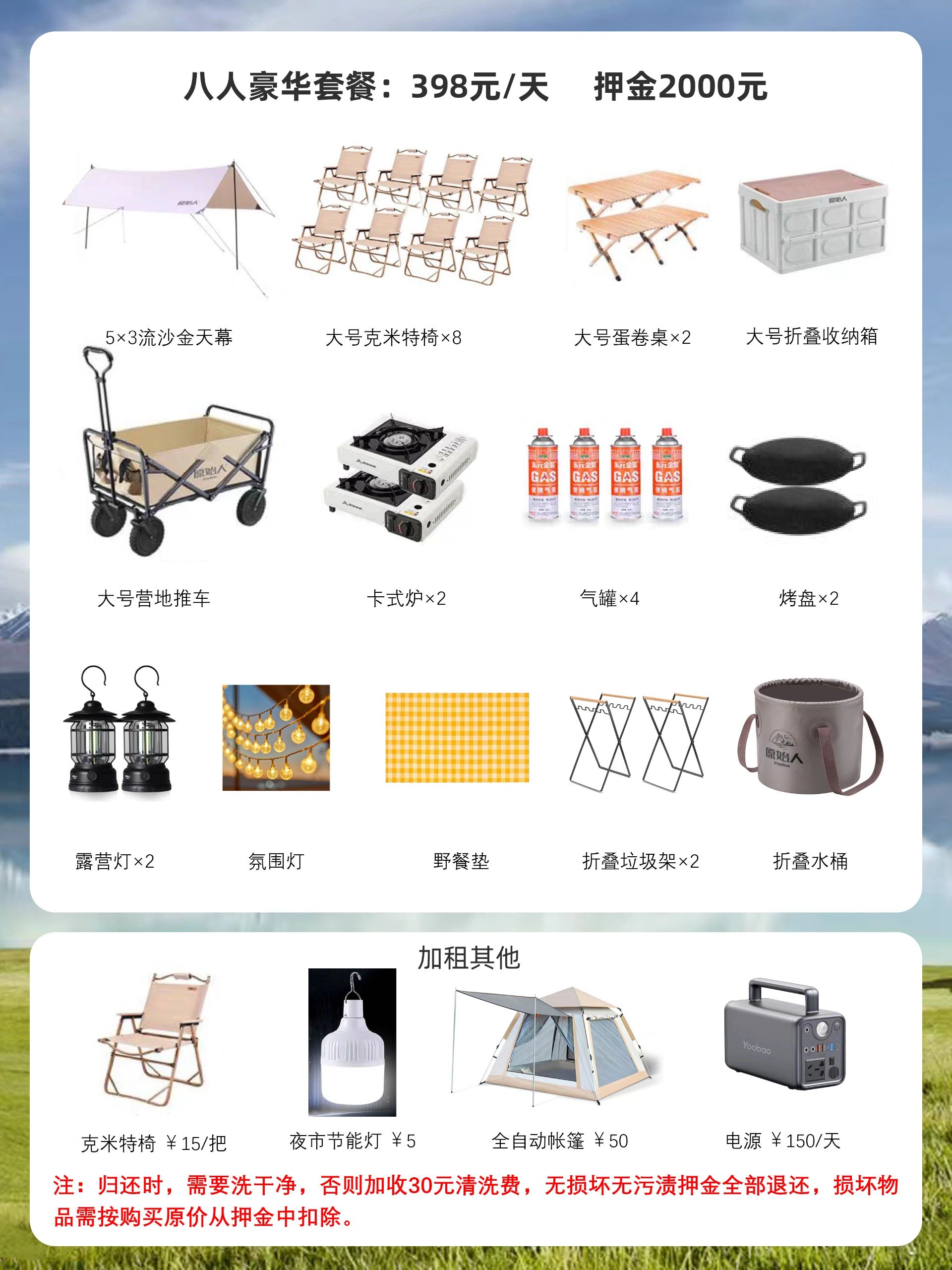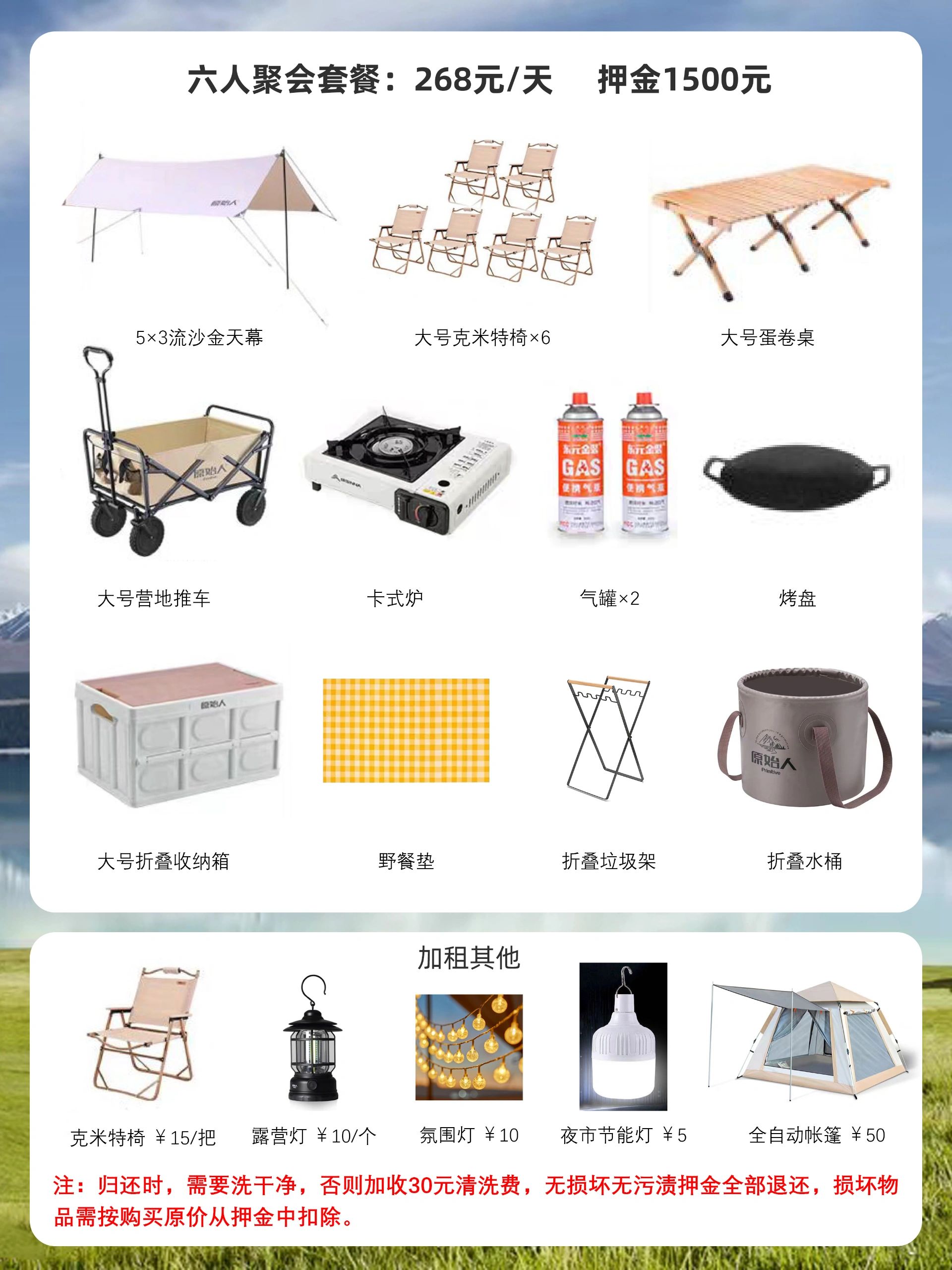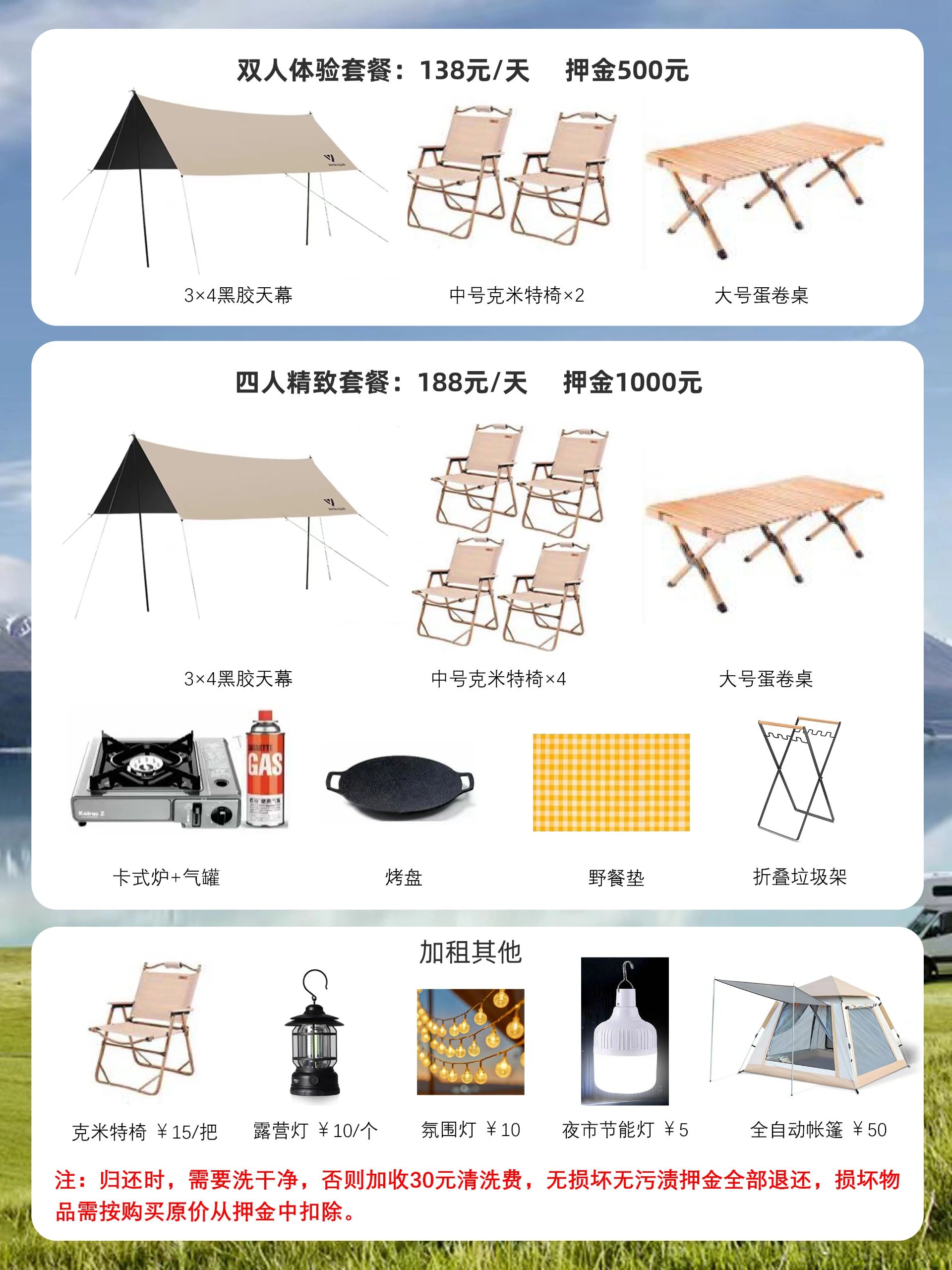 看到朋友去露营拍的照片好好看,自己也想和朋友约场露营,苦于没有设备,购入又太贵,不经常用。或者公司团建,生日派对[哇R]在苏州就不用发愁这些了,提前租一套不香吗?苏州周边露营装备租赁活动定制生日派对主题展览户外露营领域8年玩家!烧钱烧不起了,装备均为一线大牌!全新或95新,质感拍照绝对出片!天幕,克米特椅,蛋卷桌,卡式炉,烤盘,露营车,烧烤炉,全自动帐篷,野餐垫,露营灯,飞盘,狼人杀,露营麻将等,应有尽有!可根据人数有不同的套餐,您只需准备食材,其他的交给我们,来一场说走就走的旅行!可推荐免费露营地可配送搭建拆除回收