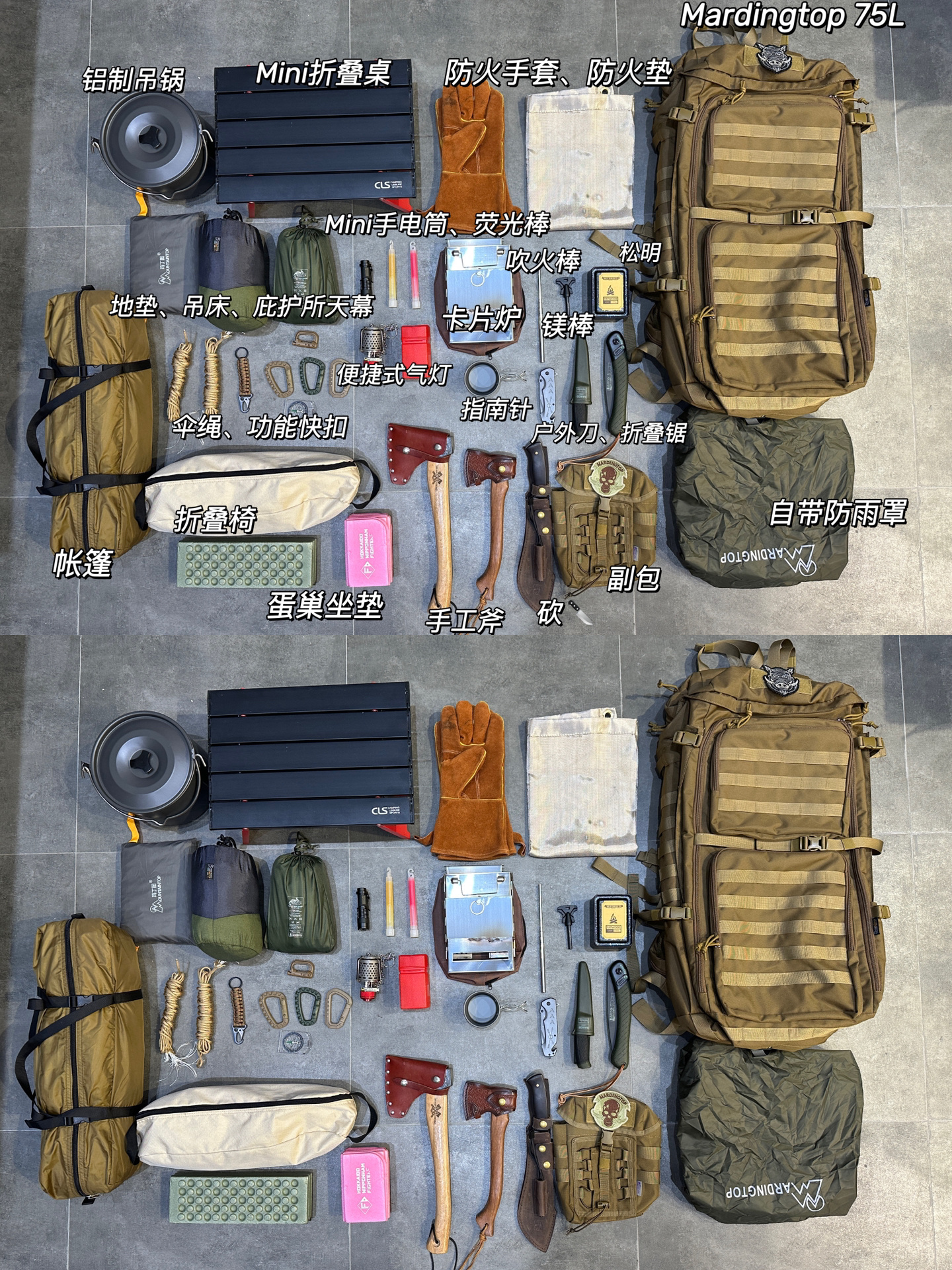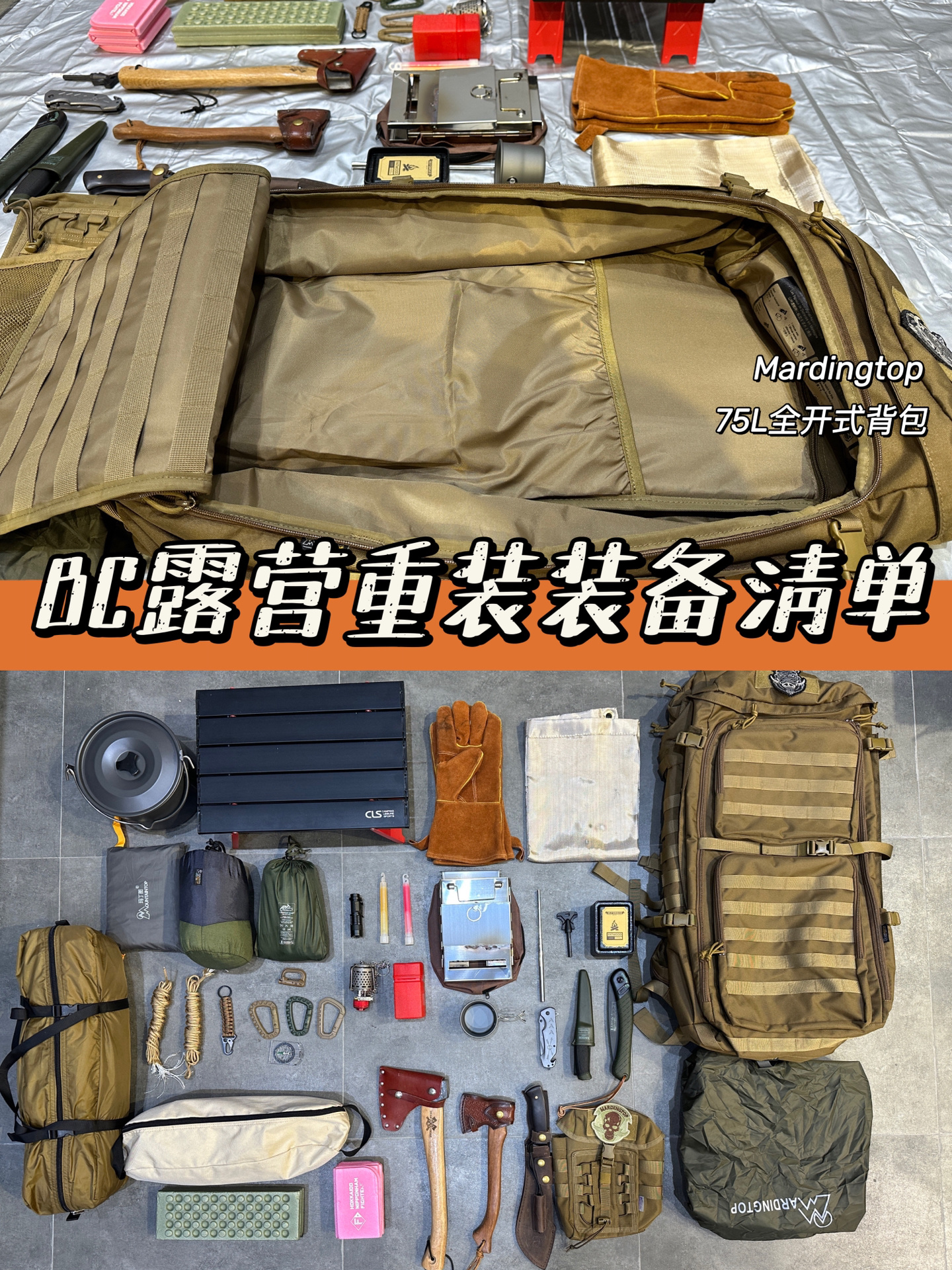 分享重装BC露营出行,按照装备清单来检查自己的物品,查漏补缺!基础露营装备:天幕,风绳伞绳,帐篷,蛋巢坐垫折叠椅,功能快扣,垃圾袋(使用后的厨余垃圾其他垃圾记得拿走!!!),露营毯睡袋(昼夜温差大,可保暖),求生信号棒,指南针(方向位置hin重要),防风煤油灯,户外太阳能充电板,卫星电话(问就是为了安全[自拍R])-BC露营户外餐厨装备:卡式炉卡片炉焚火台,木头气罐(选配),吹火棒,镁棒松明,防火隔热垫(保护森林防火人人有责),防火手套,铝杯(芬兰木杯更有调性),食材和调料(出发前需提前处理好食材,调料可用小瓶装好),铝制吊锅-户外收纳装备:战术收纳包(副包,装小工具医护包,装避免意外),露营战术75L大背包(大容量收纳更快更多),折叠收纳桌(桌面使用超方便)-其他物件:斧头(享受BC乐趣,伪BC看个人需求)、kan、短刀、折叠锯,充电宝,便捷式气灯,吊床(追求舒服,看需求)75L背包还有空余位置,可自行补充所需物品,露营装备根据自己预算去选择,BC露营去户外,大容量背包副包收纳拿取使用更方便!