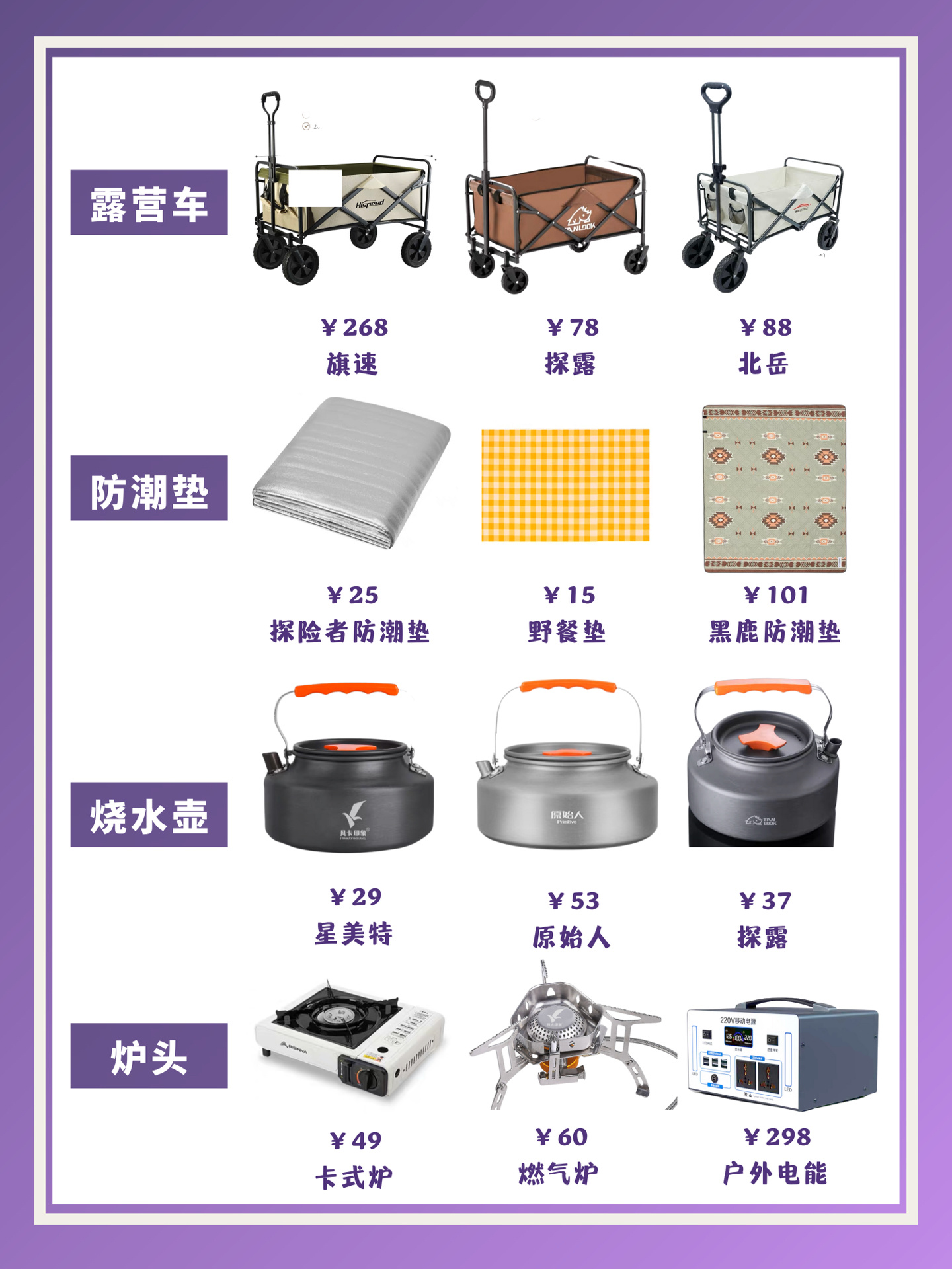 不锈钢桌小轻便,相当一部分玩家使用,看自己露营搭配做选择。露营椅不考虑重量选木制,考虑轻便选铝合金,蝴蝶椅可拆卸,便于清洗,躺着舒服。大体重男生可选择折叠椅。烧水壶铝材防锈耐磨耐高温轻便方便携带,防烫隔热提手,适合精致露营、BC露营,也上三款用的都多。防潮垫帐篷搭建,帐内铝箔垫+气垫或者其他颜值更高厚点的防潮垫
