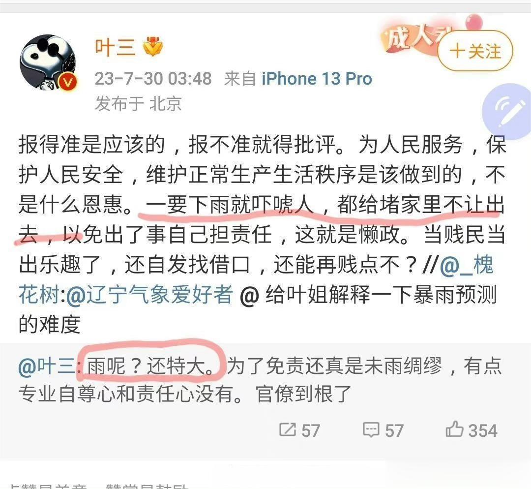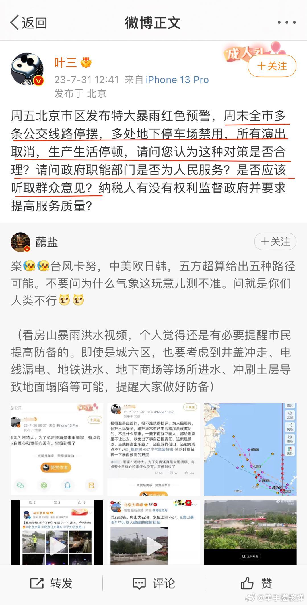 在暴雨快要来临时,北京发布暴雨红色预警+建议非必要出门,然后这个“著名作家”跳出来一直在指责北京的应对政策,甚至在北京大到暴雨已经持续2天的31号中午,这个作家还在带节奏想让大家出门……