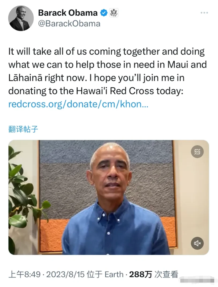 奥巴马呼吁美国人能和他一起向夏威夷红十字会捐款。奥巴马出生在夏威夷,家乡遇灾,他发声声援,不过现今62岁的奥巴马在镜头前看起来显得苍老和疲惫,不再是当年那个意气风发、充满活力的总统。