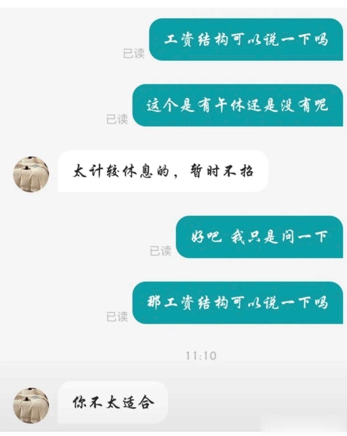 用户11xxx61 14 2023-08-17 11:43 一边说工作难找,一边又嫌苦嫌累。看来还是日子过的很滋润,没到走投无路的时候。 用户10xxx54 回复 08-17 12:37 所以你做牛做马做到乐在其中了吗?还是别人给你做牛做马习惯了见不得别人有点追求? 白龙鱼服 回复 08-17 13:21 就是,等他走投无路了再想来,连工资都不给他,没毛病,哥,不能惯着他们