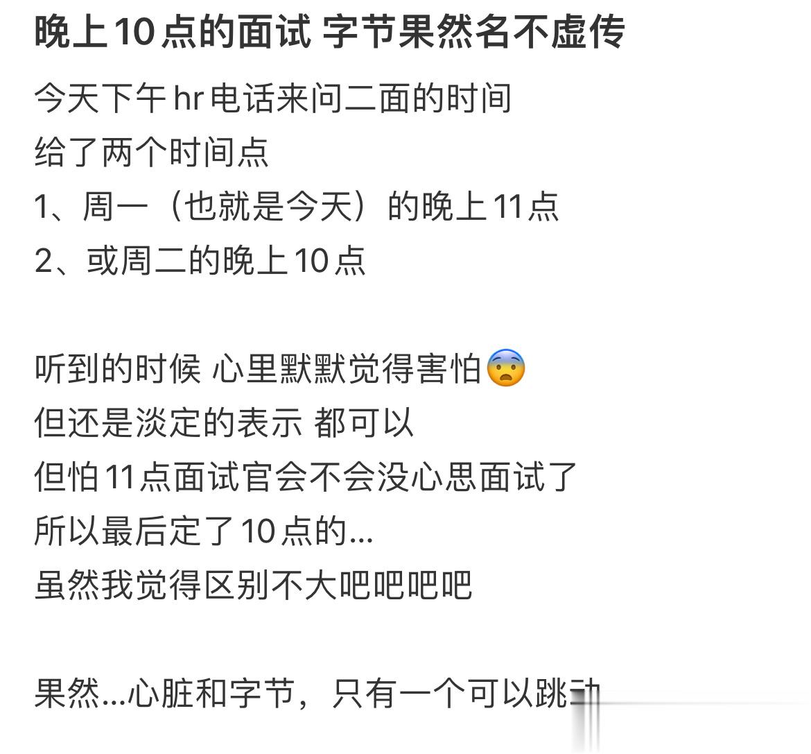 字节不愧是“和优秀的人,做有挑战的事”,晚上十点面试,不就正好淘汰一批不想加班的人么……