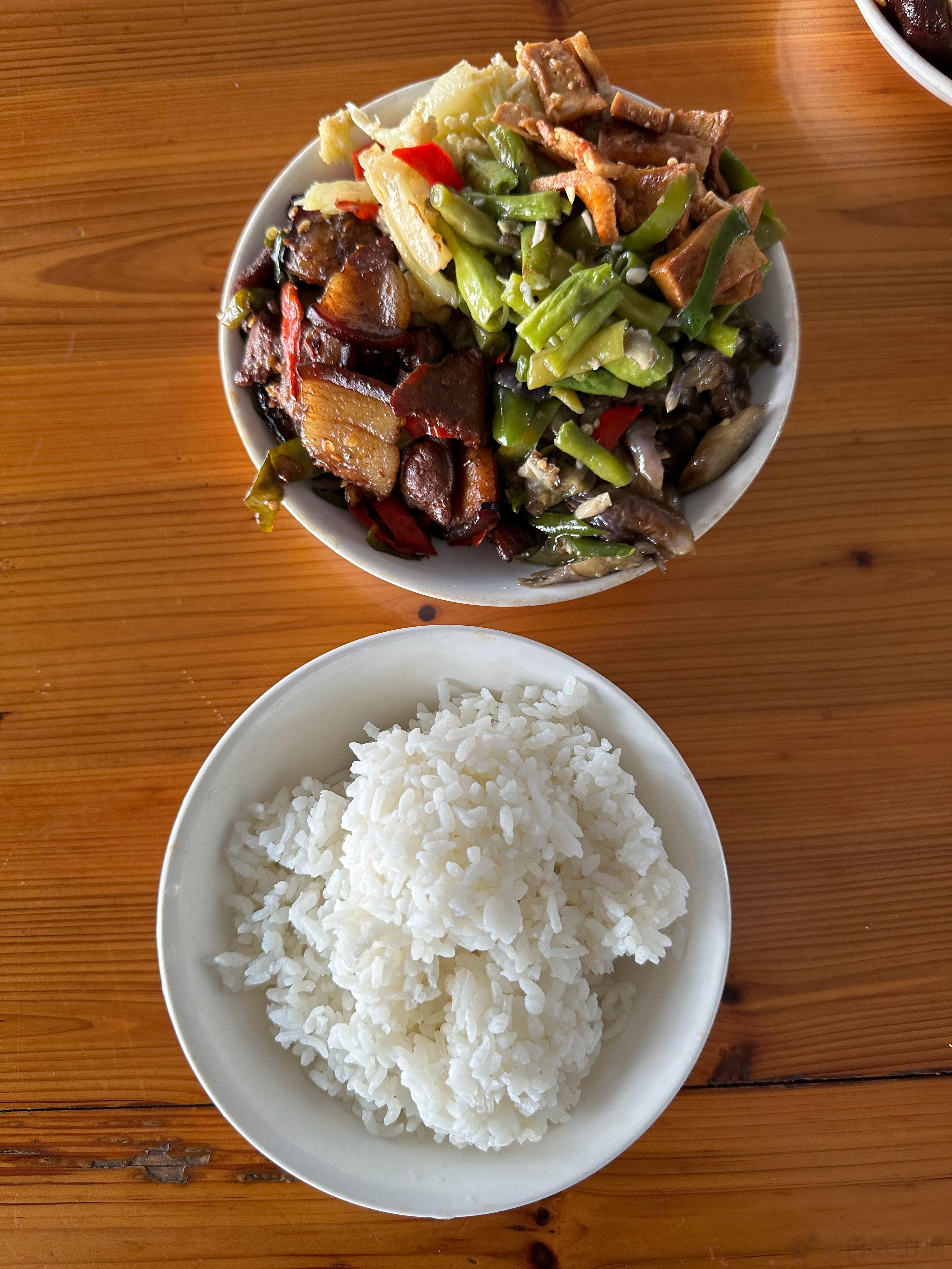 菜为猪肉、花菜、芹菜、茄子、豆腐干、四季豆。
