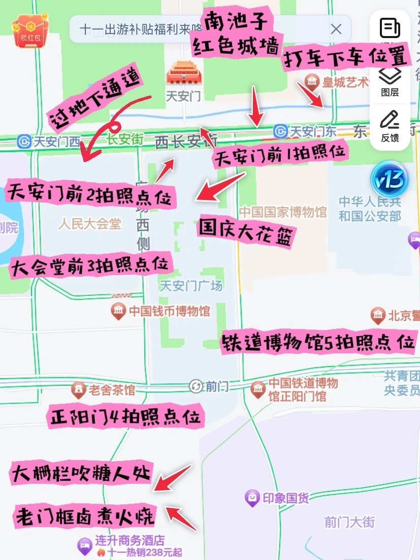 🔴游览路线:贵宾楼饭店 ➡️南池子 ➡️天安门广场 ➡️大花篮 、人民英雄纪念碑 ➡️人民大会堂 ➡️正阳门 正阳门➡️中国铁道博物馆 ➡️前门 ➕大栅栏 ➡️杨梅竹斜街
