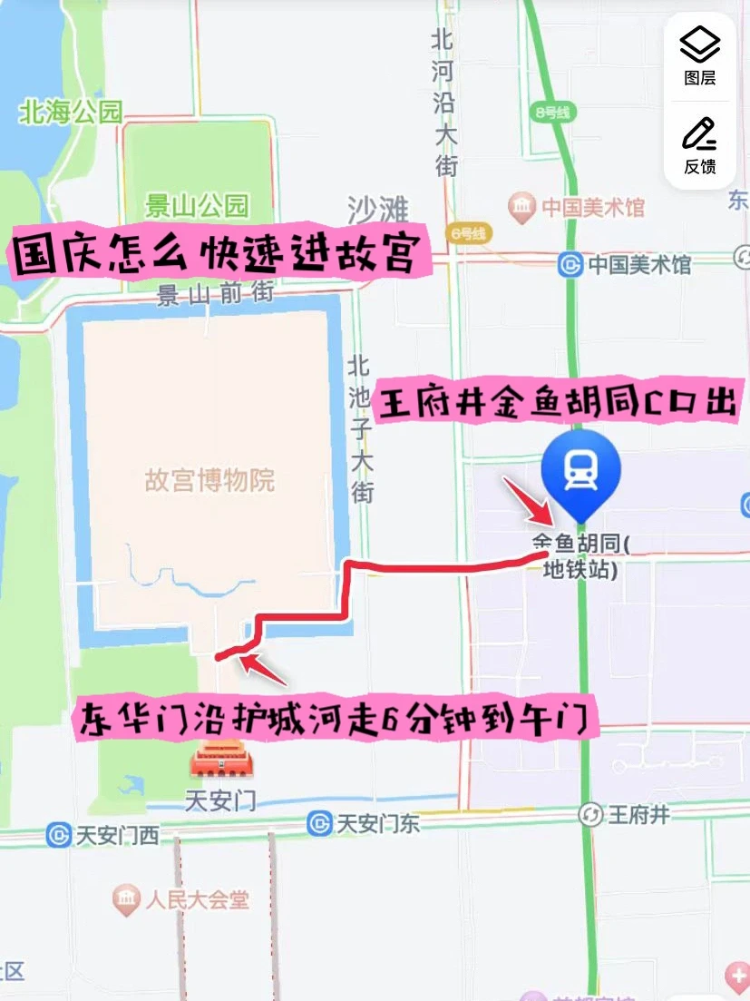 ✔️天安门 地铁东西,前门 地铁通过不停车❎,🚇到王府井金鱼胡同C口,东西马路过两个红绿灯是东华门,沿着护城河步行6分钟左右,到午门刷证