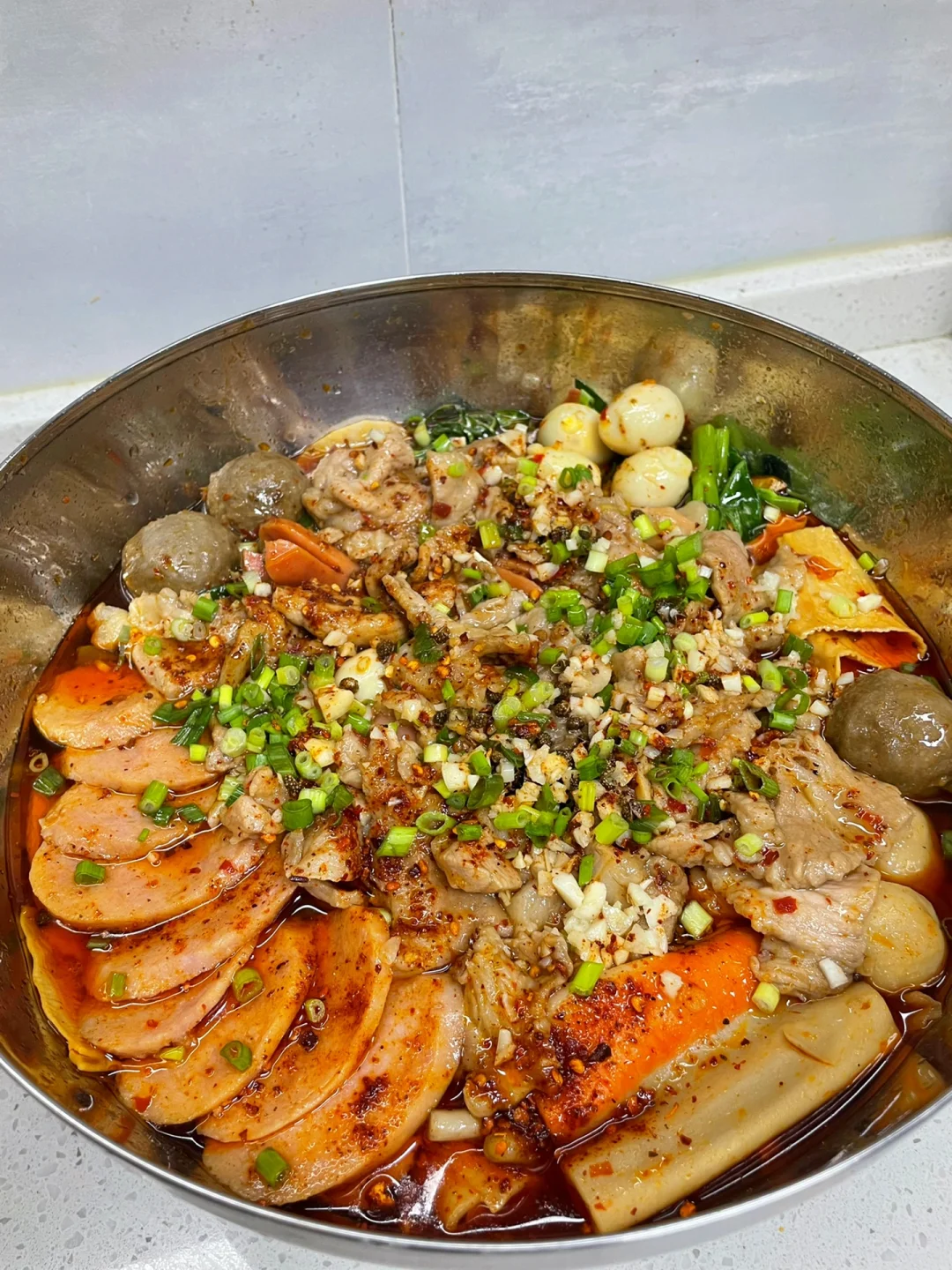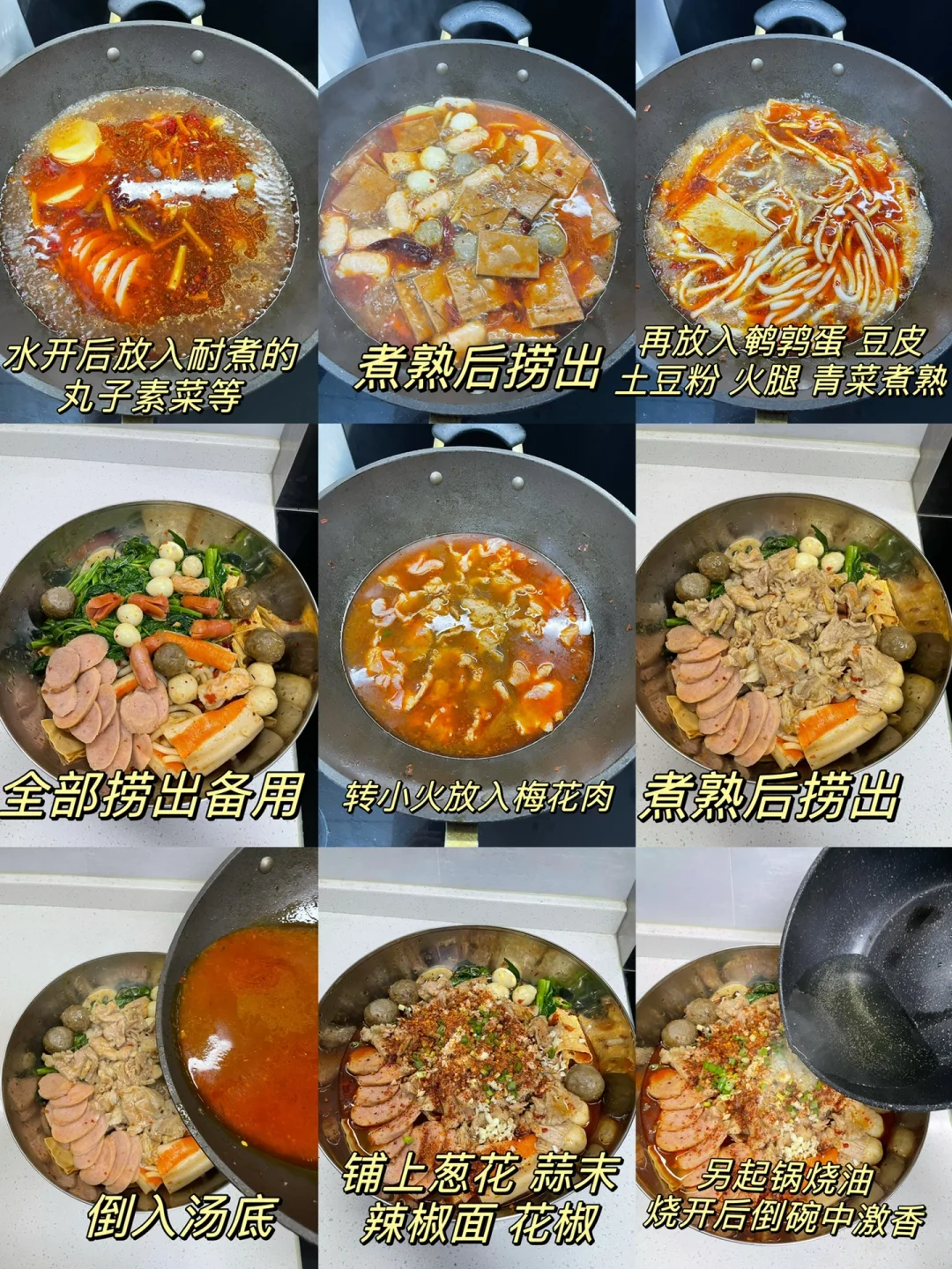 3⃣️:水开后放入耐煮的菜煮熟捞出,再放入土豆粉 鹌鹑蛋豆皮青菜等煮熟捞出,转小火放入梅花肉煮定型,再转中火煮熟捞出,倒入汤底,加入葱花 蒜末 花椒 辣椒面,另起锅烧油,倒入碗中激香即可