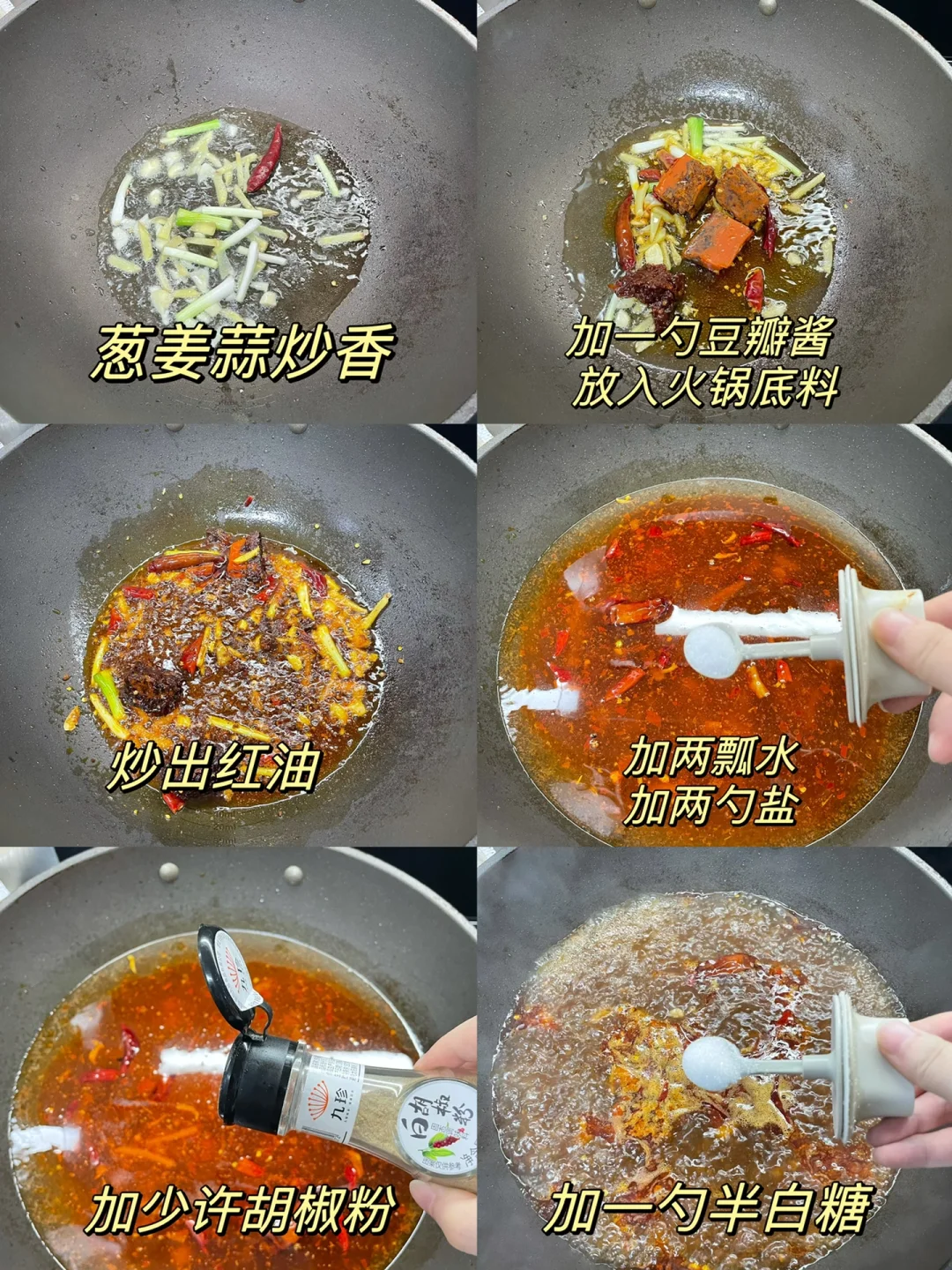2⃣️:油热倒入葱姜蒜炒香,加一块火锅底料和一勺豆瓣酱炒出红油,加两瓢水烧开,加两勺盐 一勺胡椒粉 一勺半白糖调味