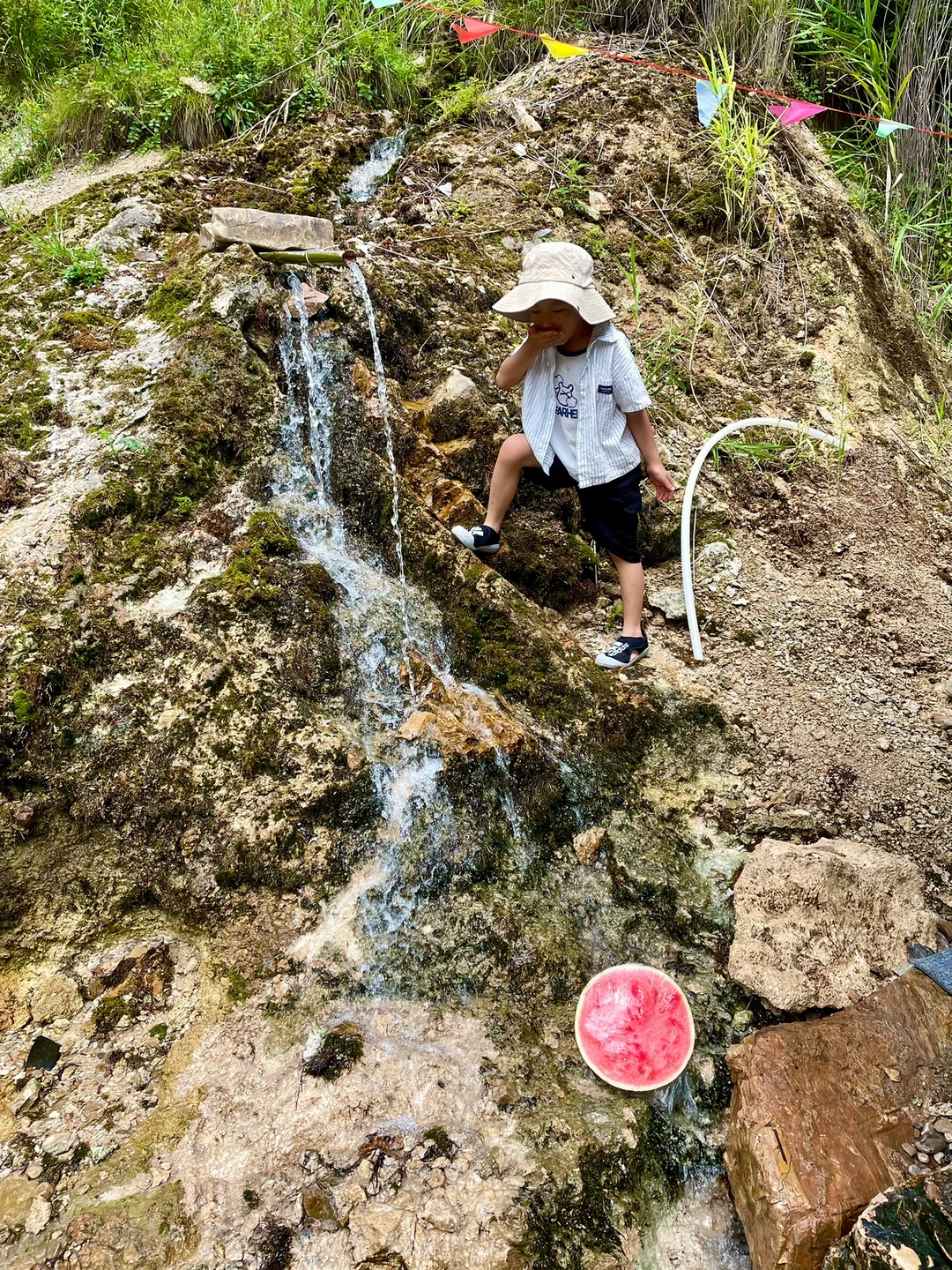 🔥明火烧烤、卡式炉都可以用,能炭火烧烤简直棒极了‼️泉水就是天然冰箱,冰几罐饮料和西瓜,太爽了