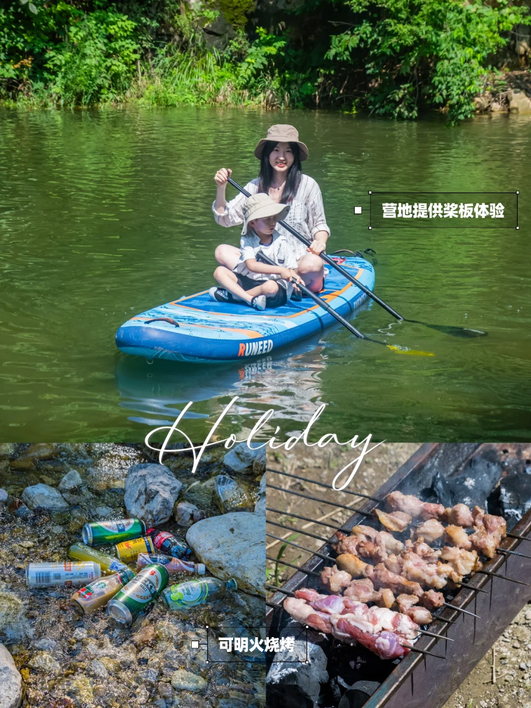 💦这里的水质太好了,山泉水可以直接饮用‼️溪流清可见底,小宝宝建议在浅滩区玩儿,水只到脚踝非常安全。营地有皮划艇、浆板可以玩儿,不用自带装备非常方便