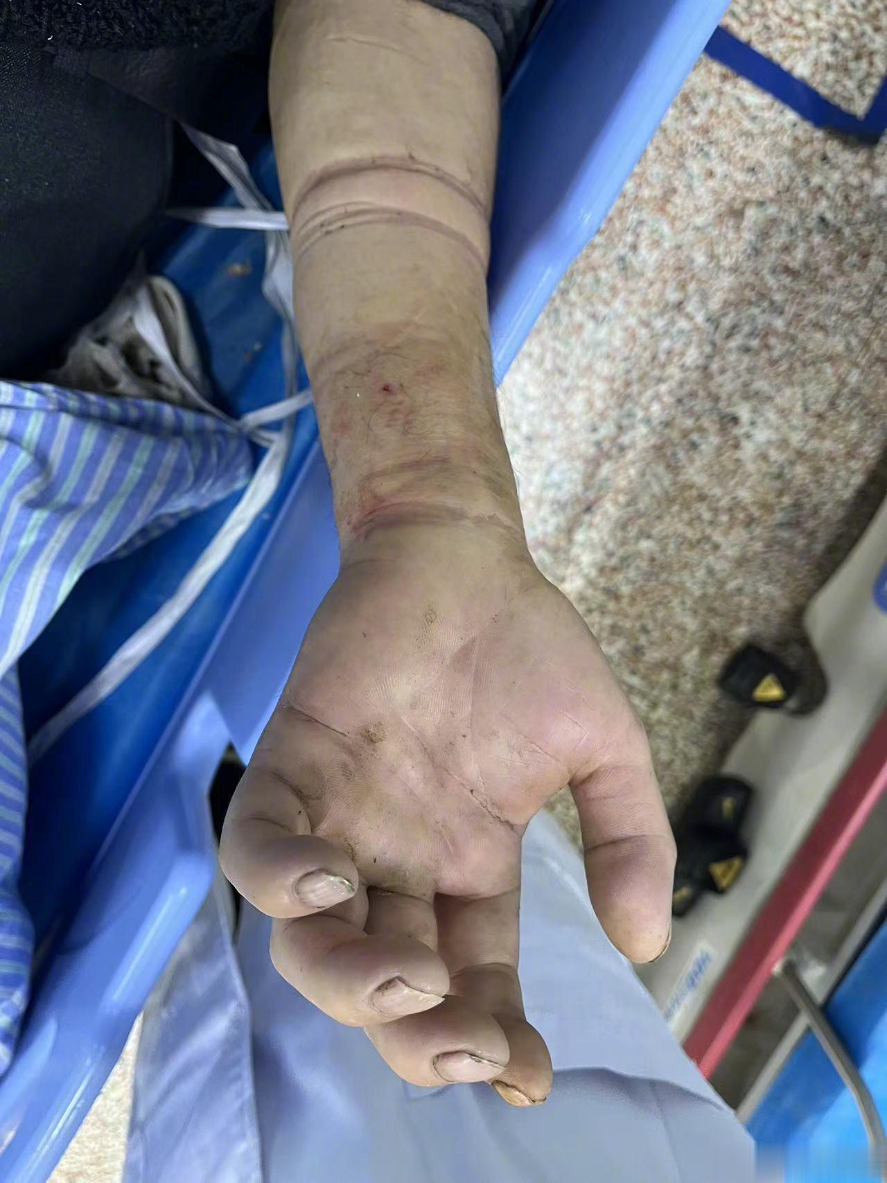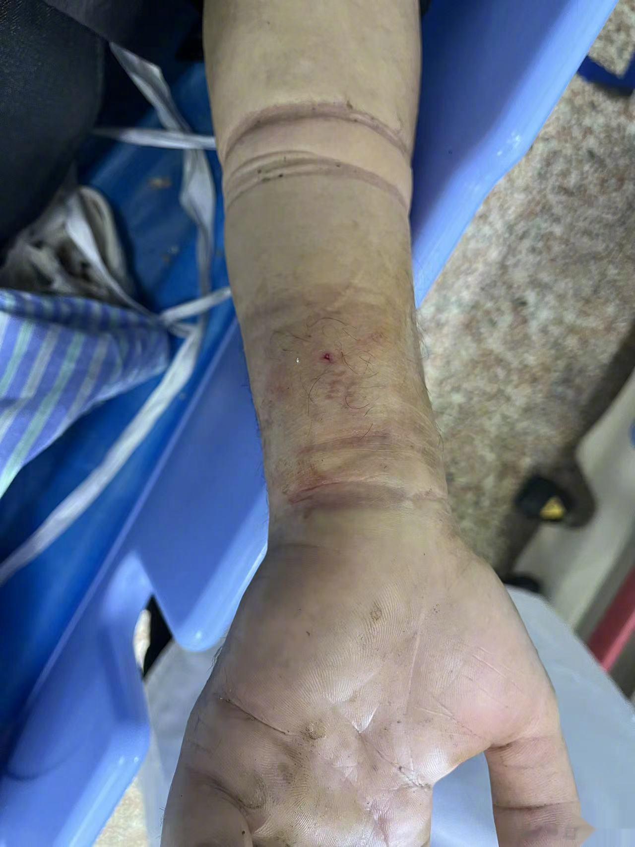 患者左前臂上有一个伤口,但已经不是原始伤口,被用针挑开过。患者在来医院之前,患者的左手臂近心端一直有结扎,结扎很紧,局部可见勒痕。