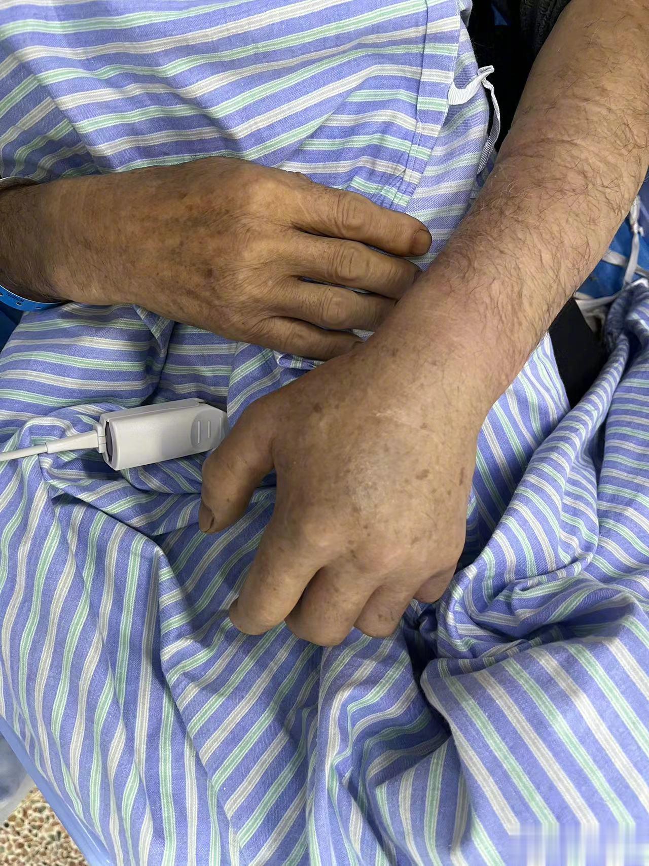 这位病人在浙江一个县里,上午8:30左右,在山上砍柴的时候,左手被不明生物咬伤。