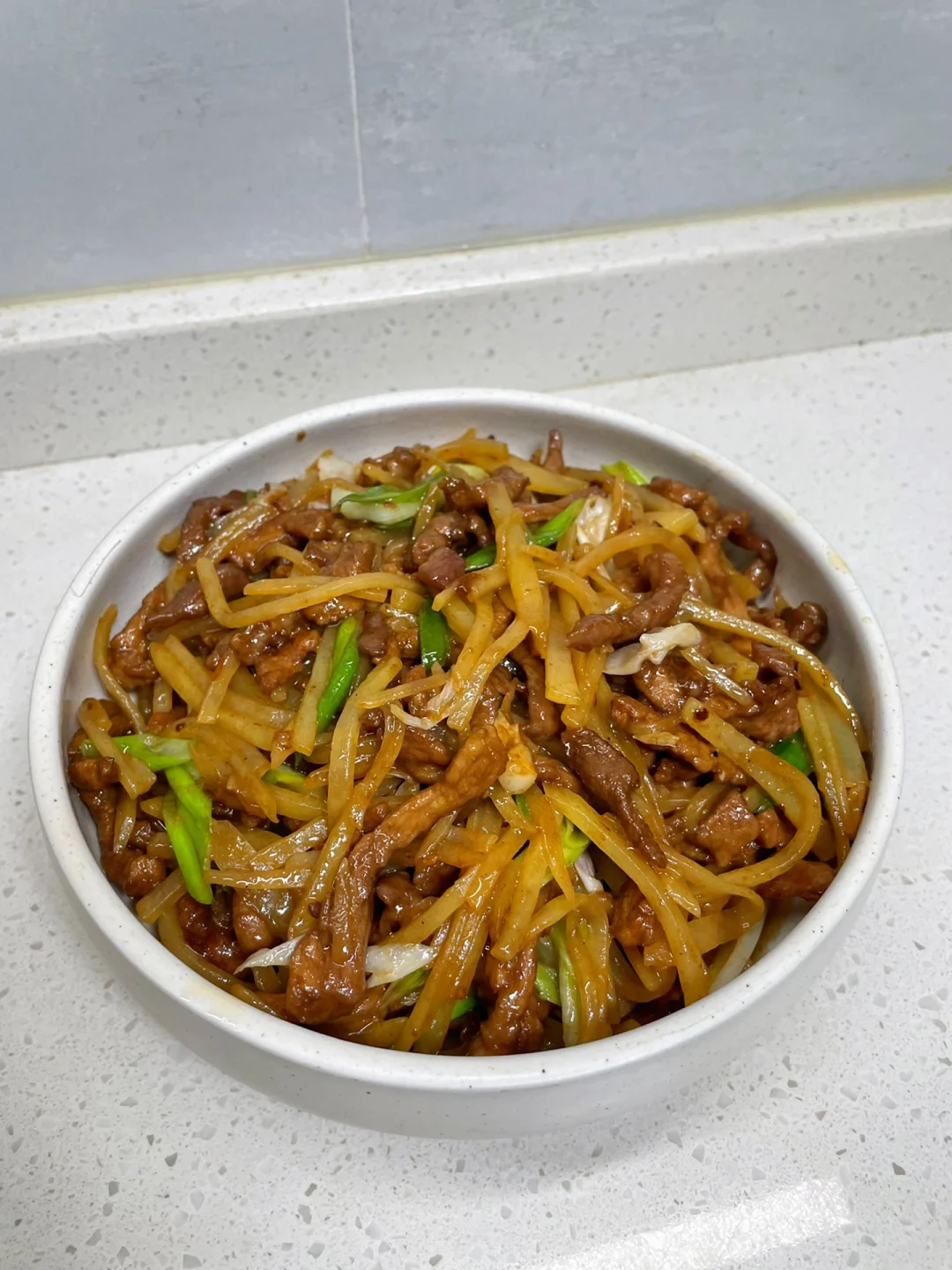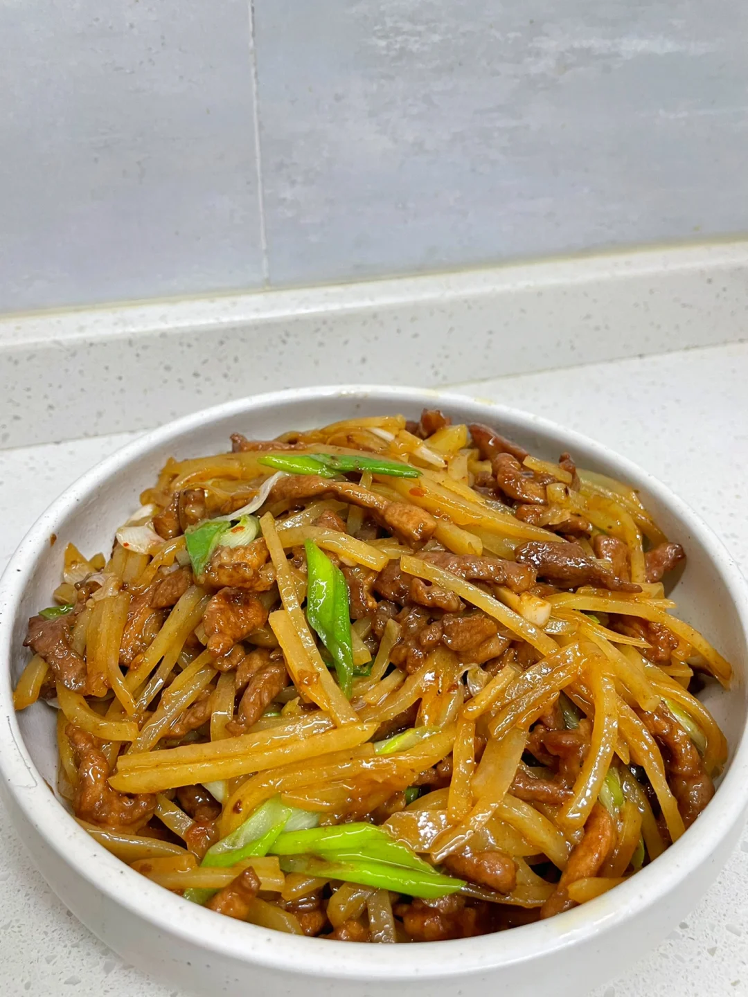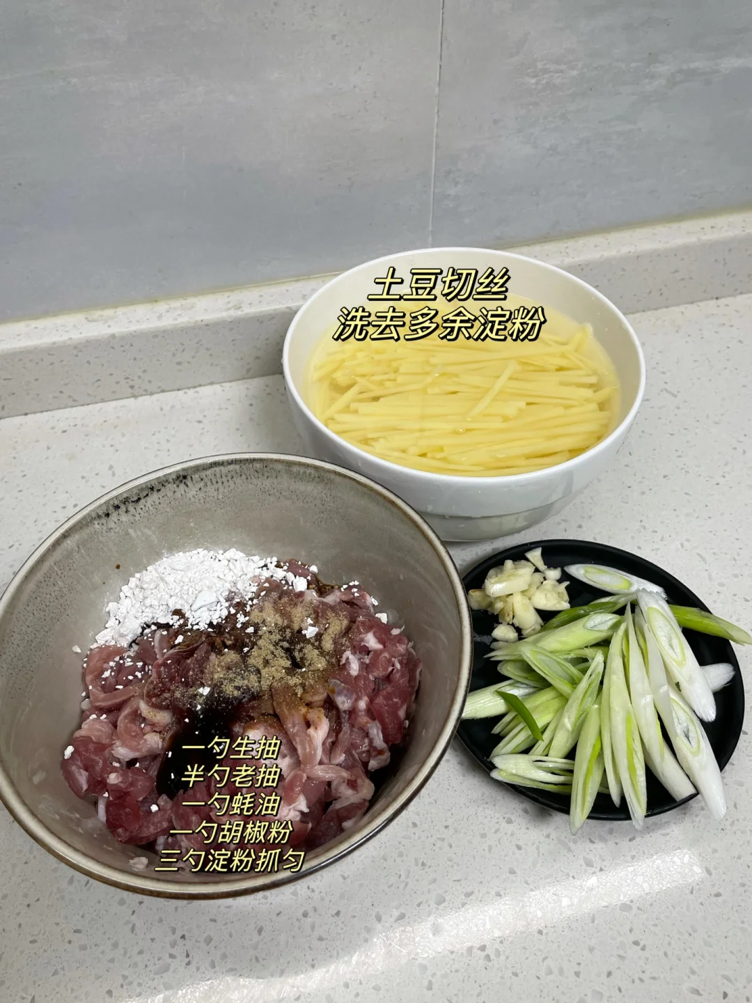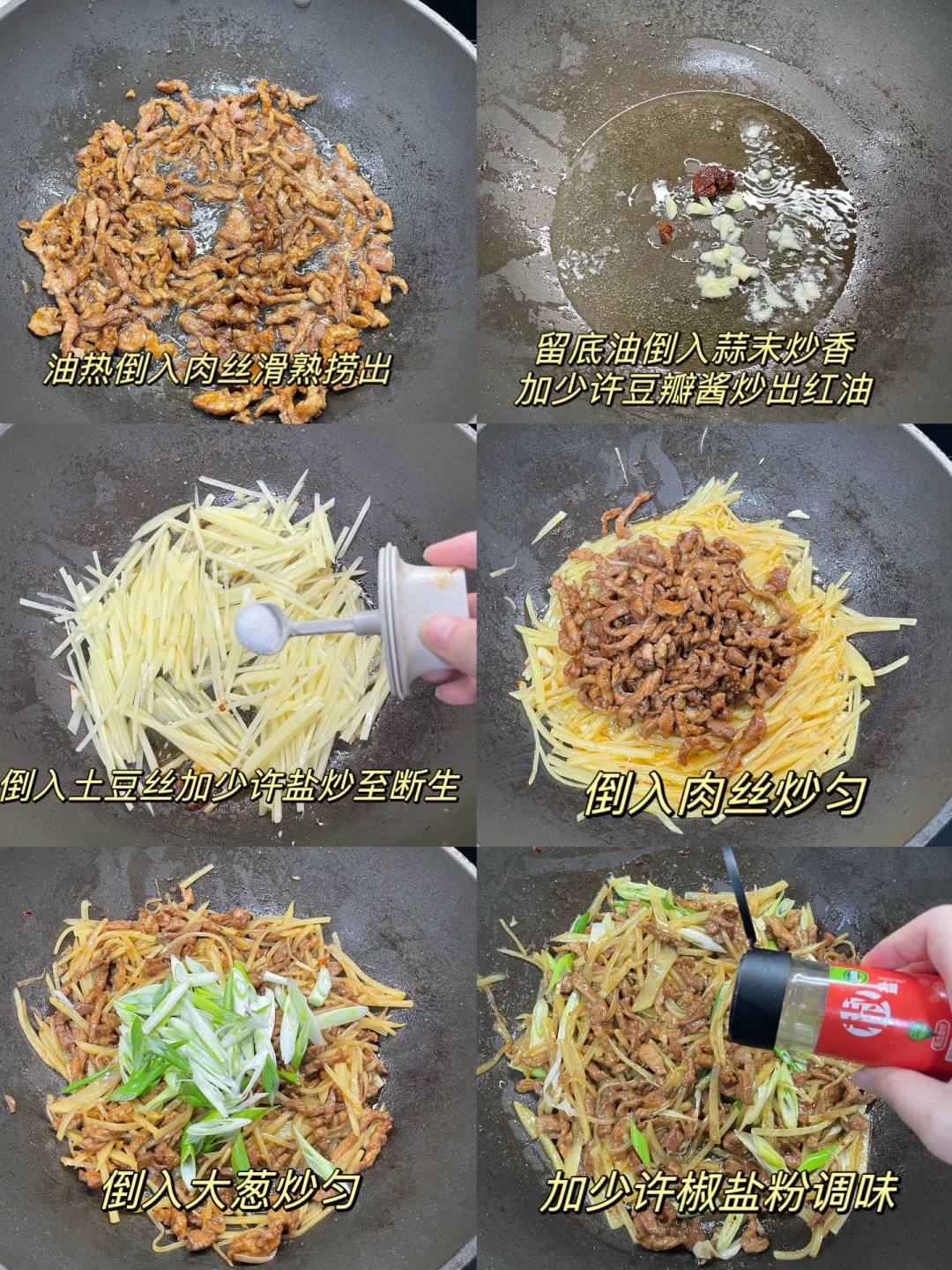 爱吃土豆的千万不要错过这道菜,美味又下饭,土豆脑袋无脑冲~ 食材:土豆 梅花肉 配料:大葱 蒜末 豆瓣酱 生抽 老抽 耗油 胡椒粉 淀粉 椒盐粉 1⃣️:土豆切丝泡水,泡去多余淀粉,梅花肉切丝,加一勺生抽 半勺老抽 一勺蚝油 一勺胡椒粉 三勺淀粉抓匀备用,大葱切段,大蒜切末 2⃣️:油热倒入肉丝滑熟捞出,留底油倒入蒜末炒香,加少许豆瓣酱炒出红油,倒入土豆,加少许盐炒至断生,再倒入肉丝炒匀,加入大葱炒匀,出锅前加少许椒盐粉调味即可