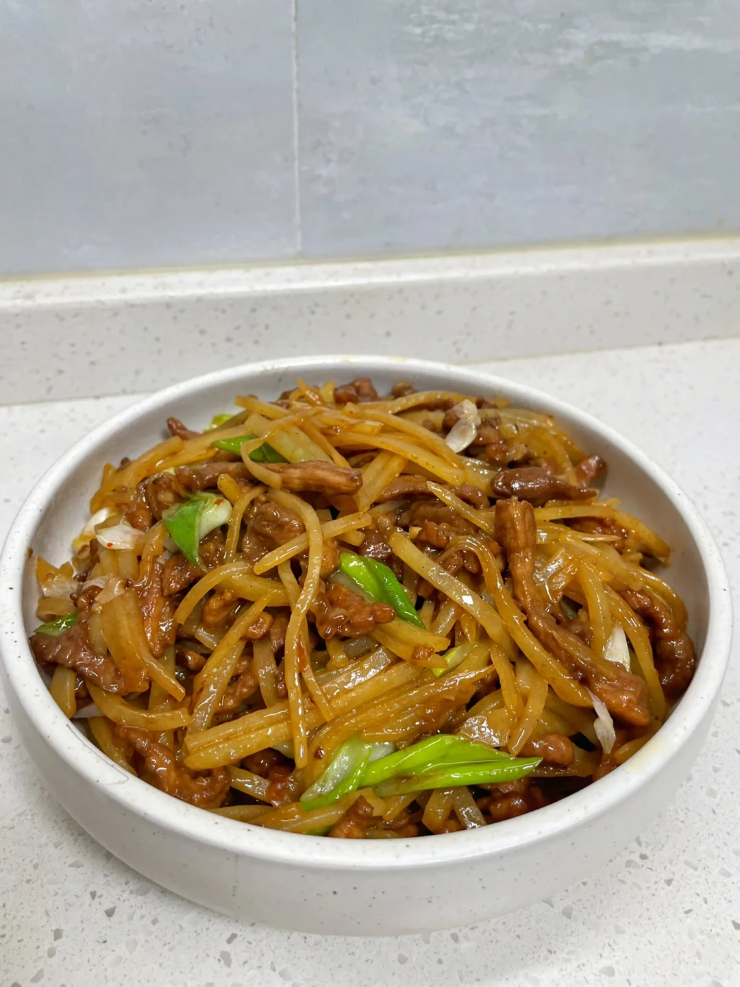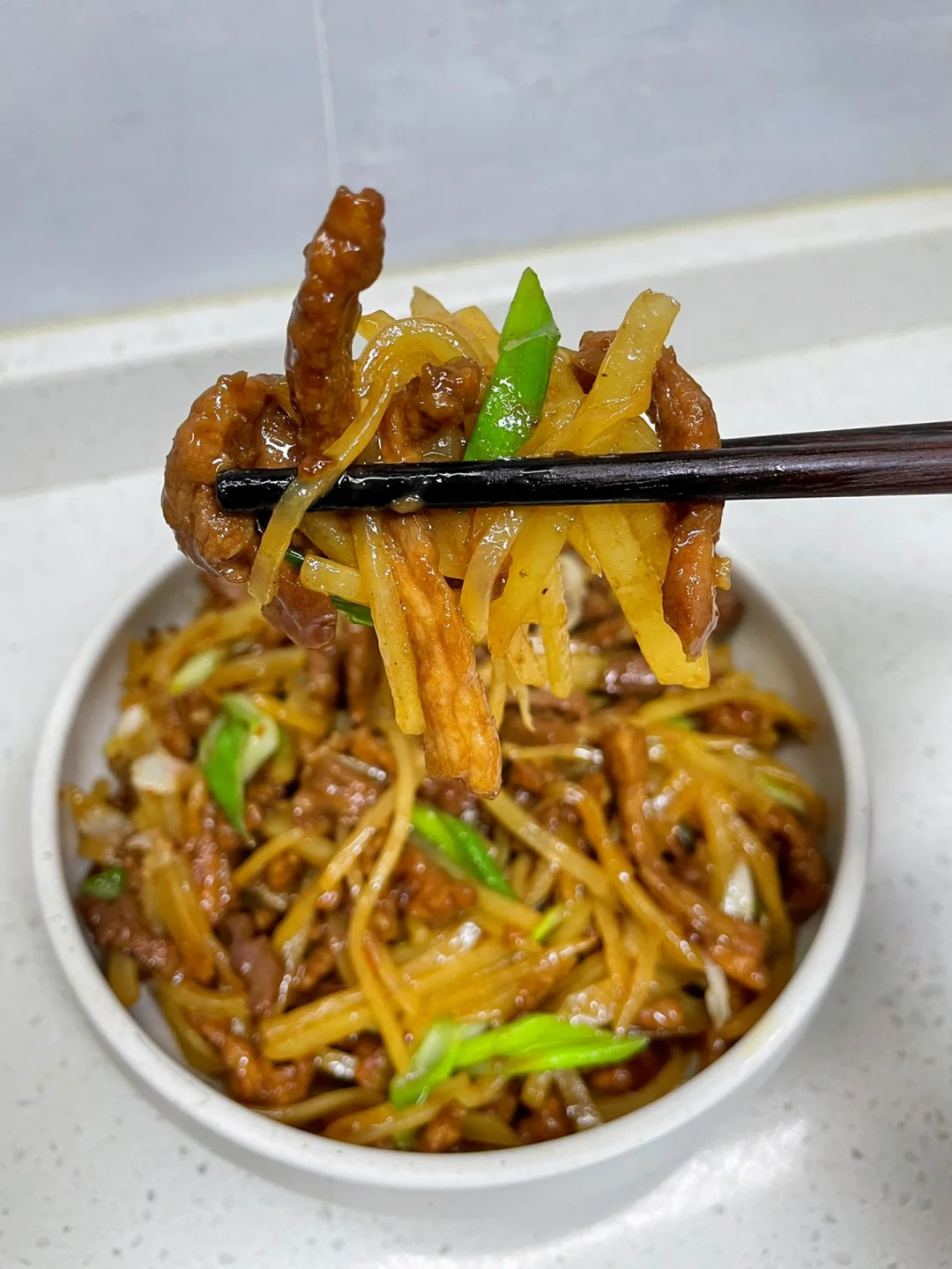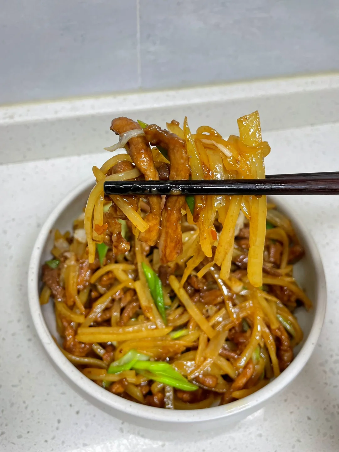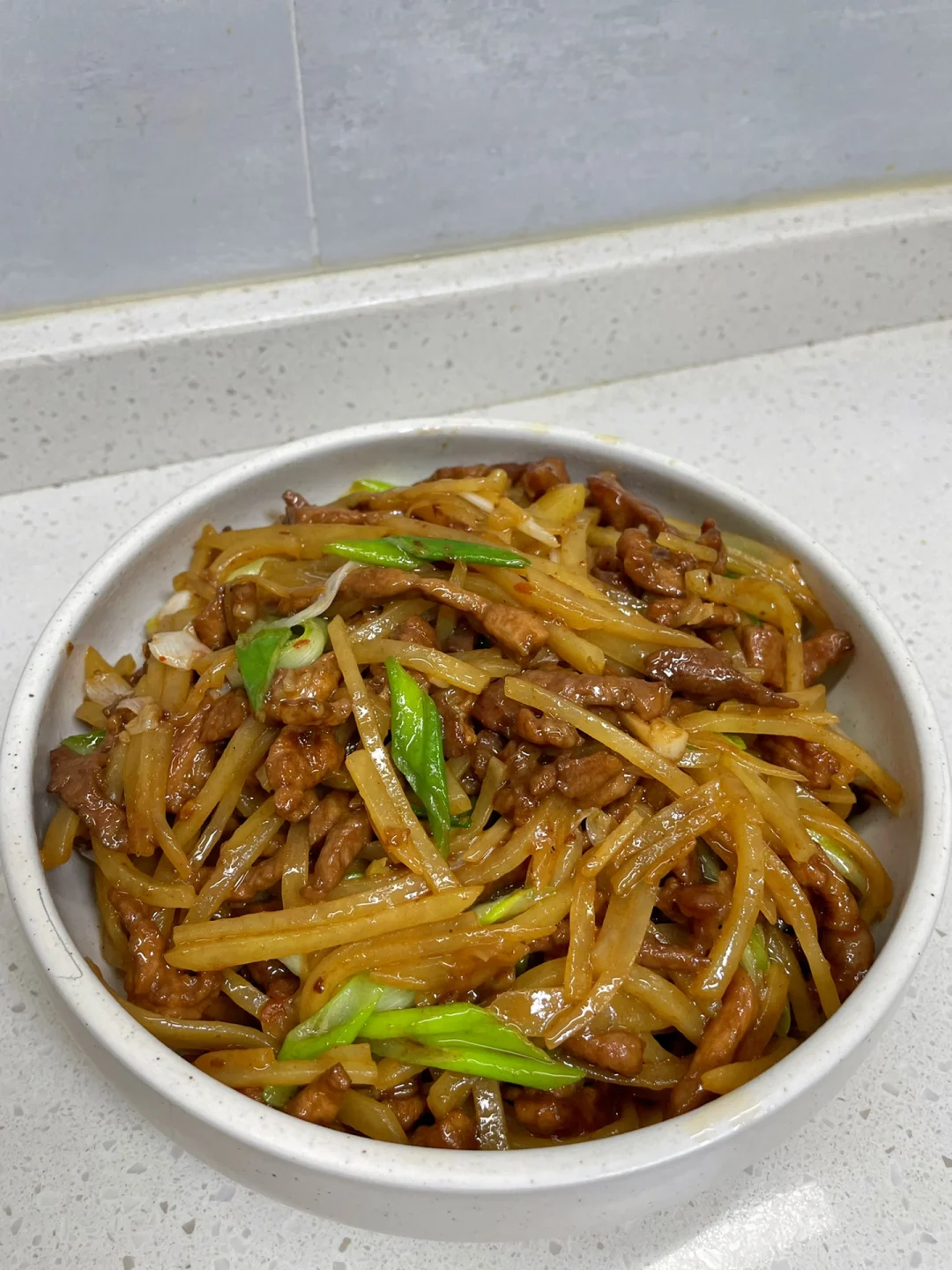 爱吃土豆的千万不要错过这道菜,美味又下饭,土豆脑袋无脑冲~ 食材:土豆 梅花肉 配料:大葱 蒜末 豆瓣酱 生抽 老抽 耗油 胡椒粉 淀粉 椒盐粉 1⃣️:土豆切丝泡水,泡去多余淀粉,梅花肉切丝,加一勺生抽 半勺老抽 一勺蚝油 一勺胡椒粉 三勺淀粉抓匀备用,大葱切段,大蒜切末 2⃣️:油热倒入肉丝滑熟捞出,留底油倒入蒜末炒香,加少许豆瓣酱炒出红油,倒入土豆,加少许盐炒至断生,再倒入肉丝炒匀,加入大葱炒匀,出锅前加少许椒盐粉调味即可
