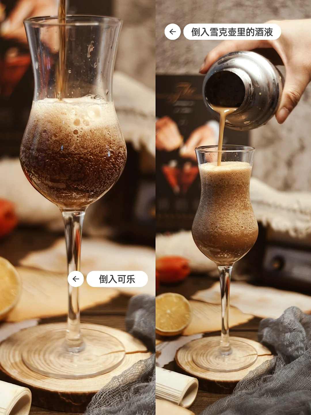 ▪️适量的可乐倒入杯中,再倒入雪克壶里的酒液