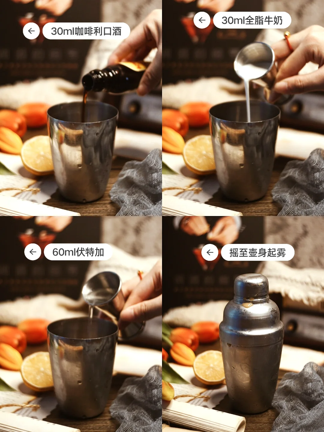 ▪️雪克壶里依次倒入30ml咖啡利口酒、30ml全脂牛奶/淡奶油、60ml伏特加,加入冰块,摇至壶身起雾