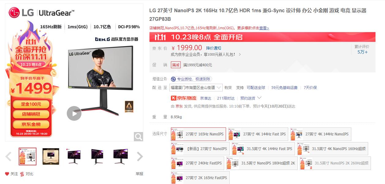 【双11超值推荐】LG 27GP83B电竞显示器目前特价中,大促期间的到手价格不高于1499元,非常超值了。 这款显示器采用三面微边框设计,搭载了27英寸的Nano IPS面板,显示比例为16:9,178°/178°可视视角,分辨率为QHD 2K(2560×1440),刷新率为165Hz,响应时间(GtG)为1ms,亮度为400尼特,对比度为1000:1,支持HDR10,DCI-P3色域为98%。 它支持AMD FreeSync Premium,英伟达G-Sync Compatible,配备了2个HDMI接口、1个DisplayPort 1.4接口、以及1个3.5mm音频插孔。