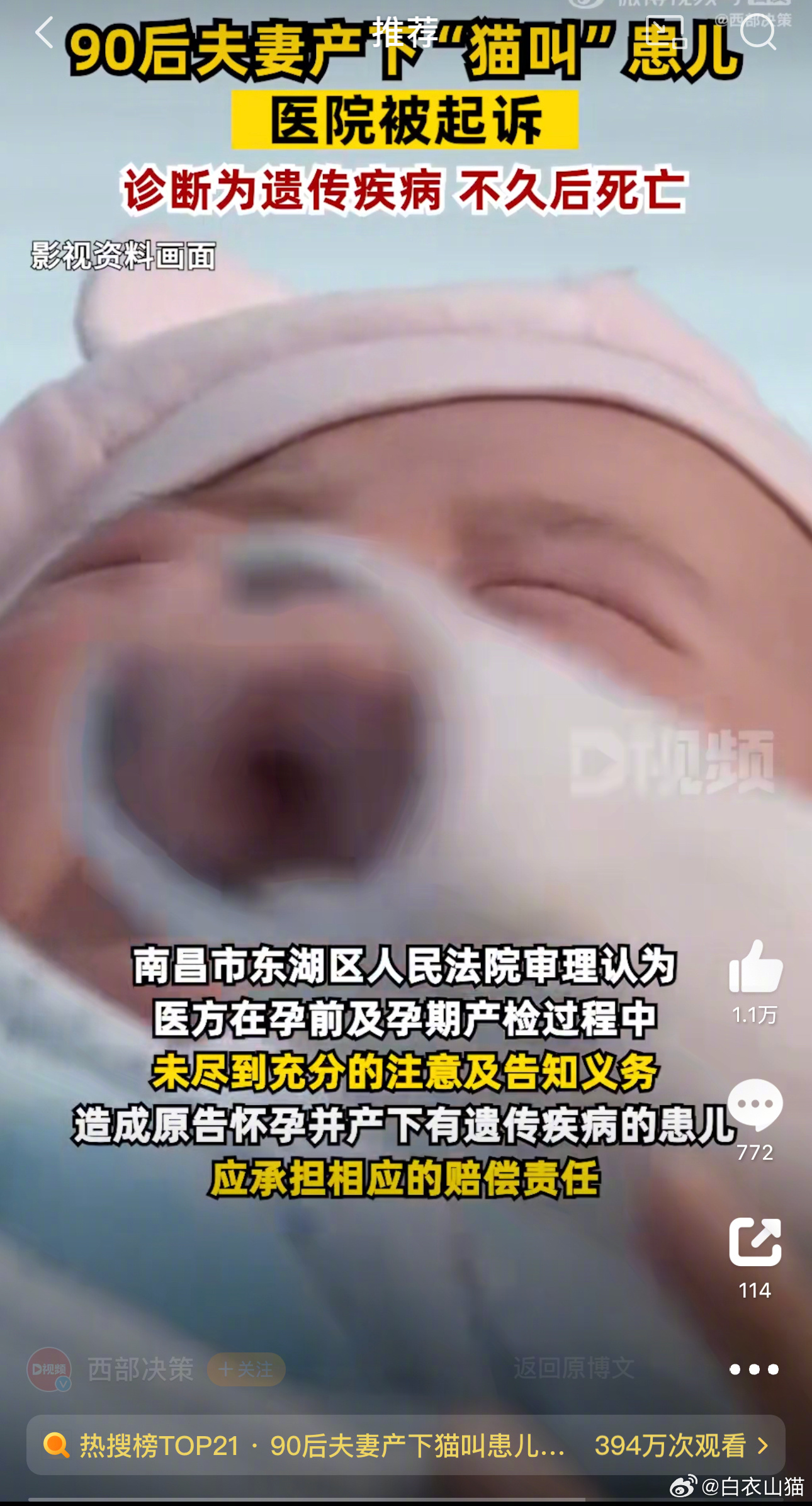 #90后夫妻产下猫叫患儿医院被起诉#猫叫综合征病因第5号染色体短臂缺失,又名5p—综合征,为最常见的缺失综合征,因婴儿时有猫叫样啼哭而得名,其原因在于患儿的喉部发育不良或未分化所致,发病率约为1/50000,女患者多于男患者。