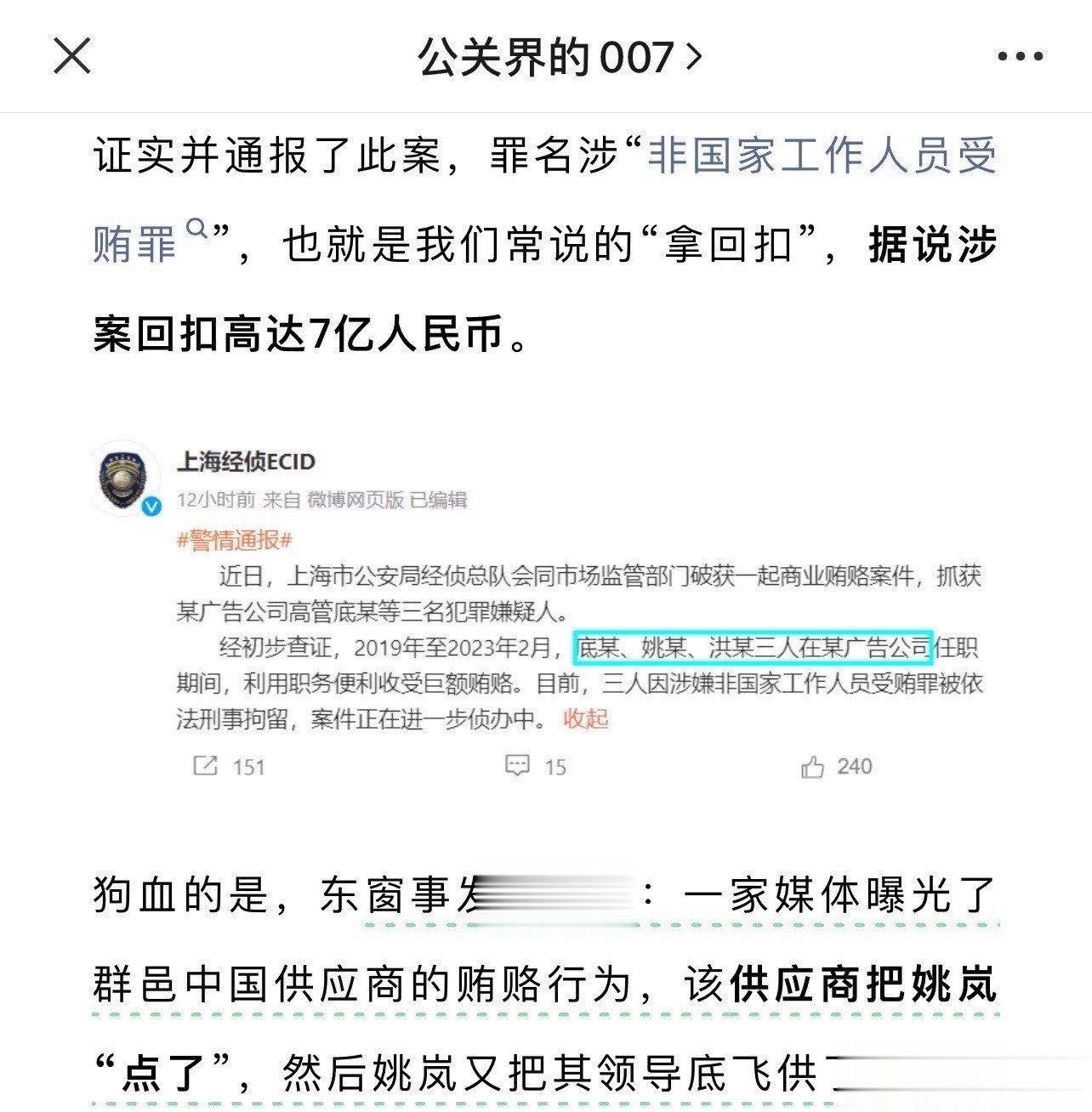 江山如画 1 2023-10-26 19:59 某大公司每年大千万宣传物料费用,主管甲给了乙广告公司,乙每年给300万回扣甲,乙公司主管把单发给丙厂,丙厂每年给乙100万回扣,丙厂采购了丁的原料,丁每年给丙主管10万回扣…物料按时按质交付,大家都满意。以上链条2005年亲历… 江山如画 回复 安、然 10-27 18:53 也有直接自己做厂的,比如当年丝宝集团,但术业有专攻啊… 安、然 回复 10-27 15:07 何必找中间商赚差价呢