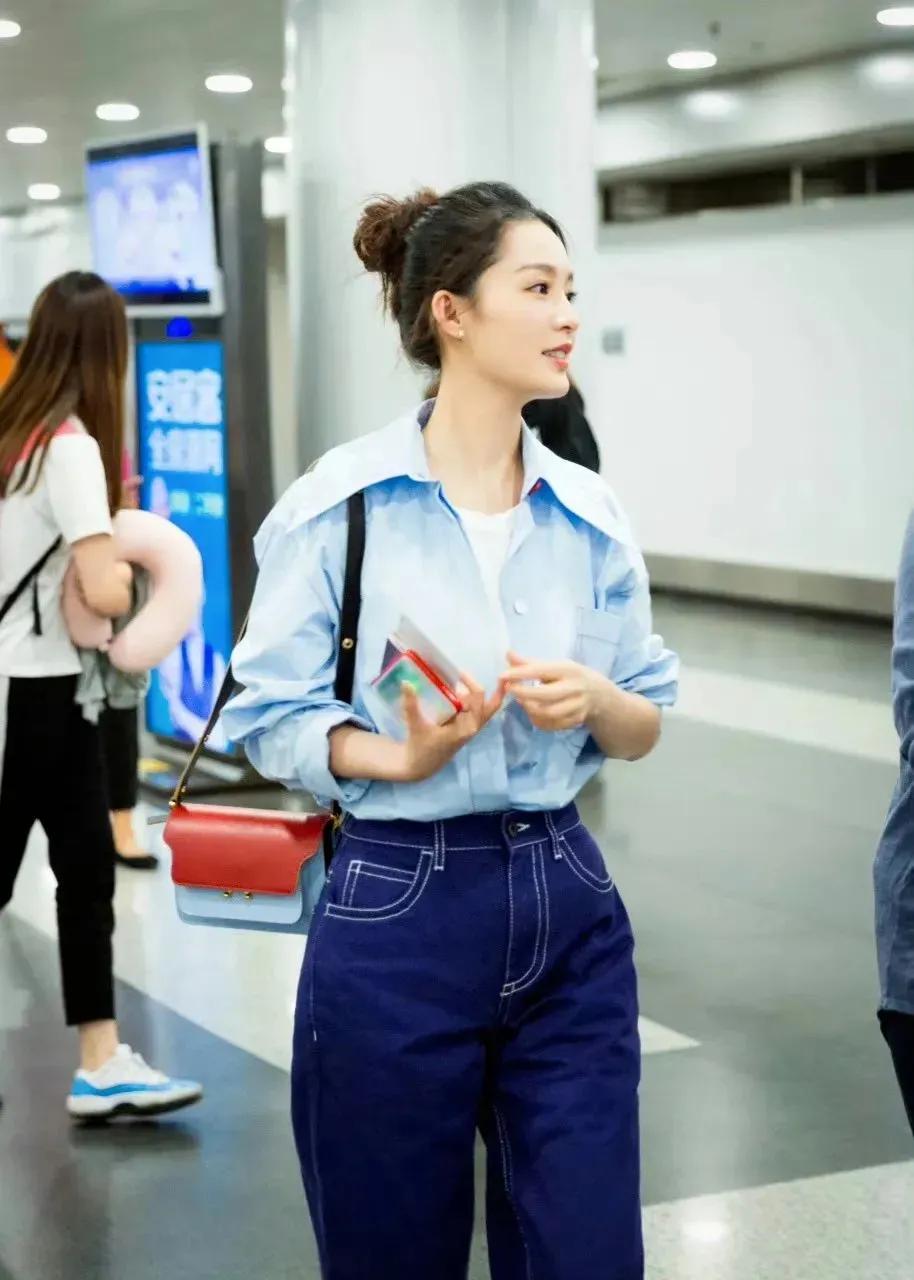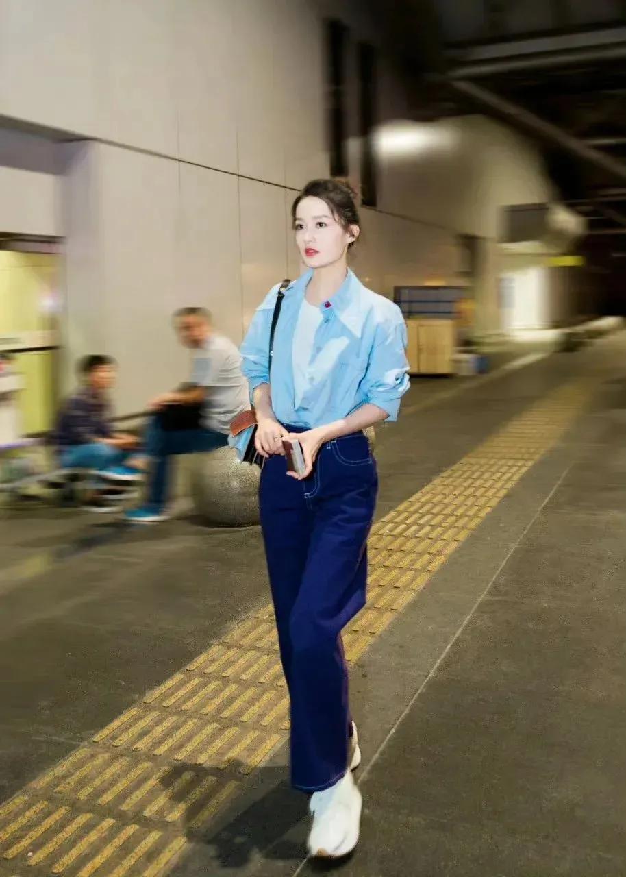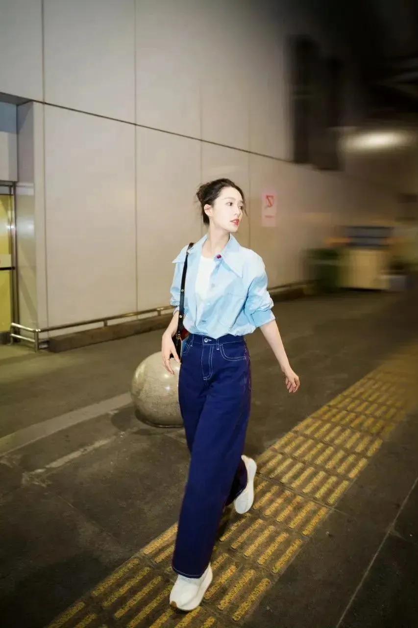 衬衫➕牛仔裤,真的是有一种干净澄澈的美! 李沁穿浅蓝色衬衫,配一条深蓝色高腰直筒牛仔裤,显得双腿修长又挺拔,比例感也太好了吧! 身材比例不太完美的女人,在这个秋天都可以试试衬衫➕高腰牛仔裤的组合,清爽大方还显腿长! 全身都是蓝色系的搭配,利用了色彩深浅上的差别,塑造出层次感,也是大气又高级。 #秋日生活打卡季#